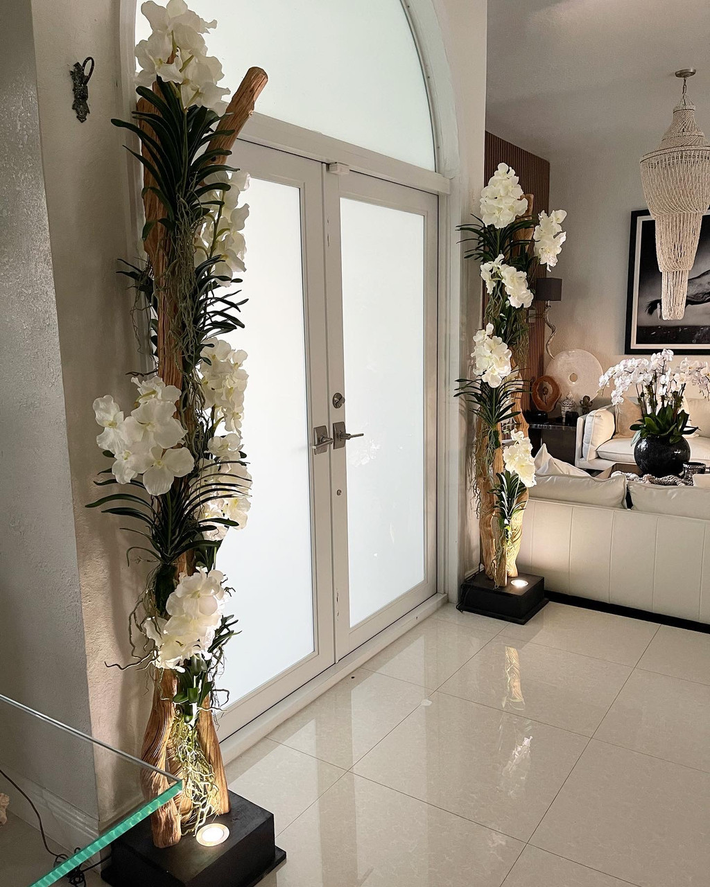 This beautiful and seductive Liana Sculpture Floor Lamp adorned with white Vanda orchids is an absolute eye-catcher and a wonderful unique addition to any room. The LED spot light on the base bathes the liana wood and orchids with warm light, igniting a cozy and sexy atmosphere. This is a beautiful sculptural piece to enjoy during the day as it transforms into a statement piece at night. The base consists of a solid wood panel, which adds an extra touch of elegance.