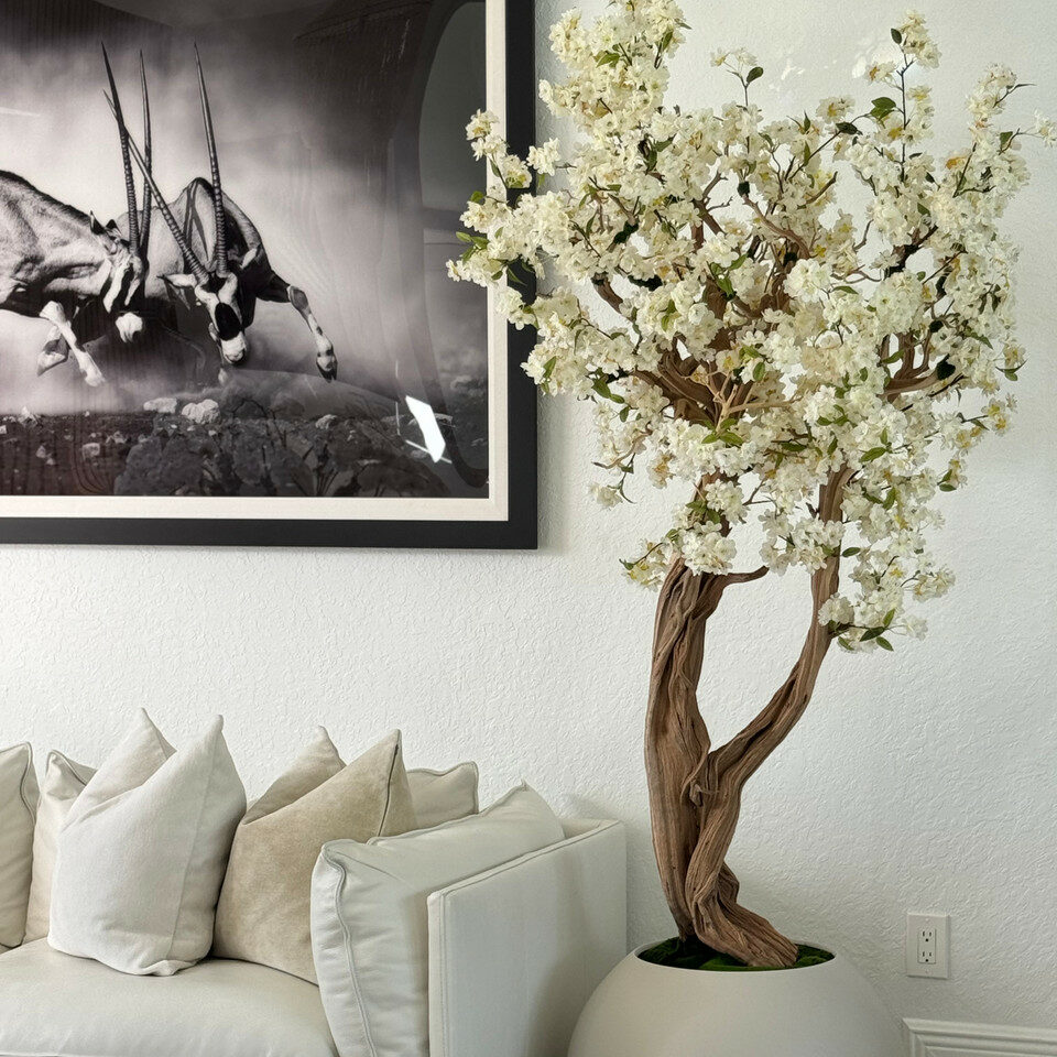 Cherry blossoms are a symbolic flower of the spring, a time of renewal, and the fleeting nature of life. Anchored in our matte 24″ globe vase which showcases a basic spherical shape, only with a modern twist. The full globe shape is the quintessential mix of traditional and contemporary styles as the round planters easily compliment any space around the home, garden or office. Its size and shape provide a perfect canvas for a our large white cherry blossom tree. Each tree is a one of a kind, flowers are placed by hand by our skilled artisans onto large wood trunks of california mountain wood. This bouquet of elegant white cherry  adds a fresh and stylish touch to any room.