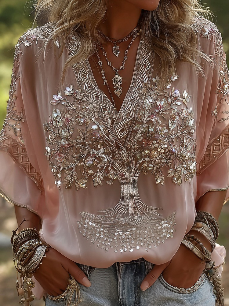 Women's Vintage Viking Tree Of Life Pattern Casual Linen V-neck T-shirt