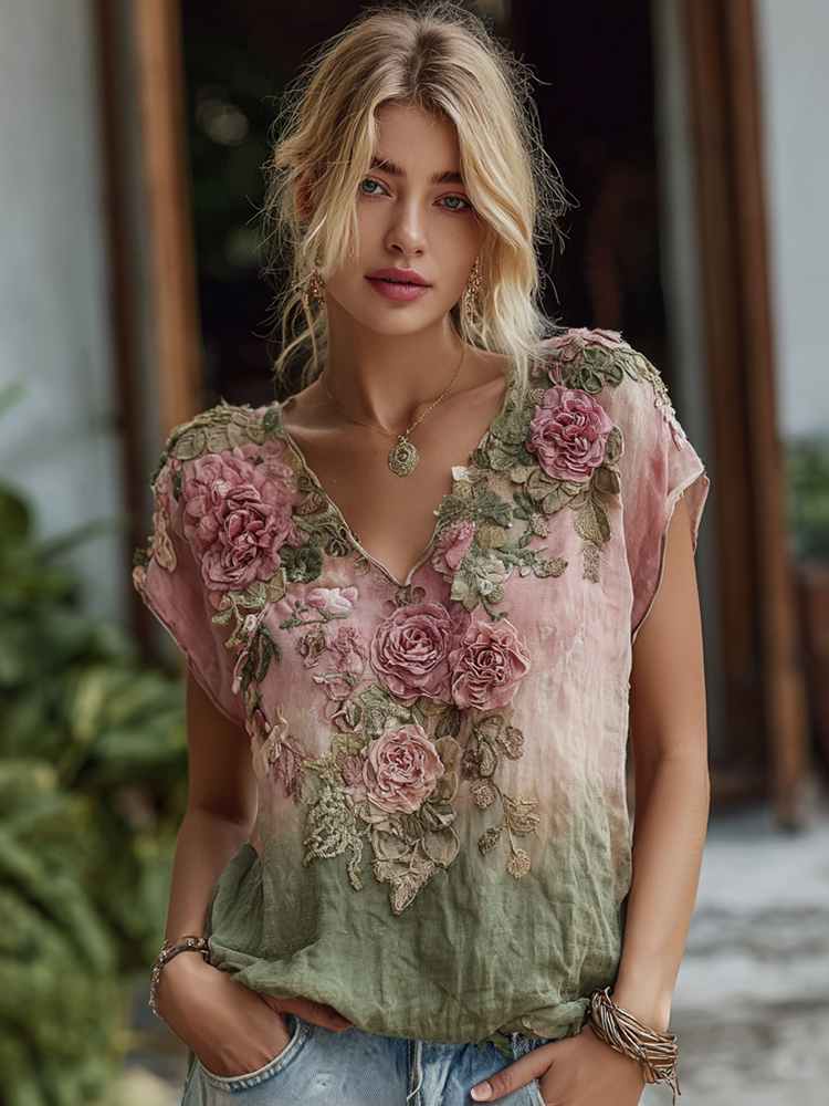 Women's Vintage Classic Gradient Flower Embroidery Print V-neck Short Sleeves T-shirt