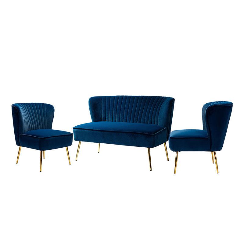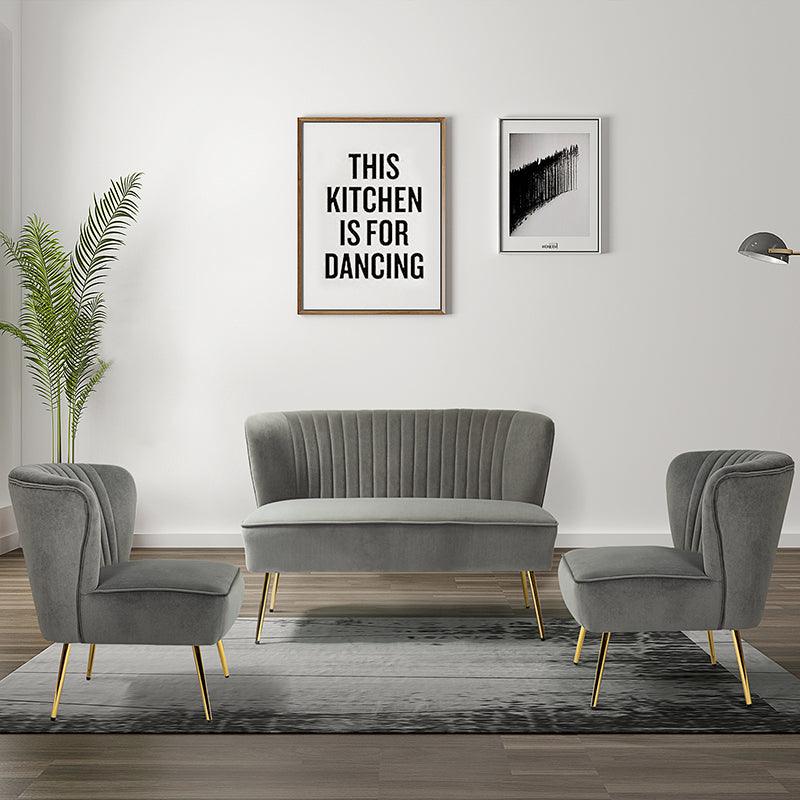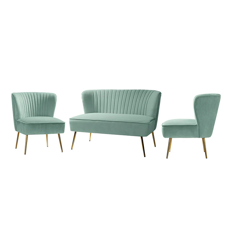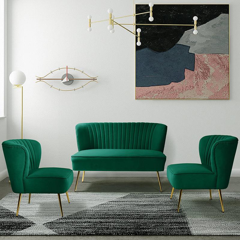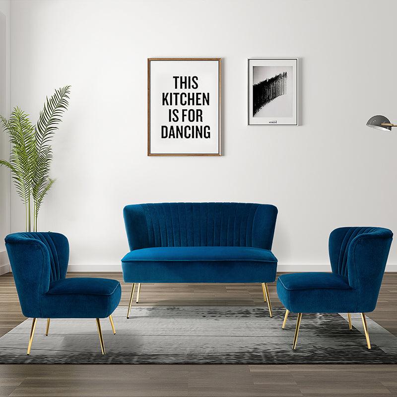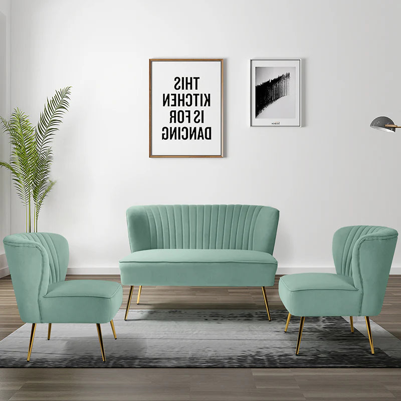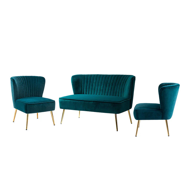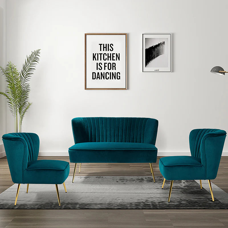 Anchor your living room in trendy, contemporary style with this three-piece living room set, including one loveseat and two matching side chairs. Crafted from solid and manufactured wood, each piece is wrapped in foam-filled velvet upholstery with gold metal legs support. This beauty is luxurious in appearance. Liven up your home with this ensemble to provide a relaxing yet eye-catching addition to your family. Plus, this three-piece living room set is defined by an iconic silhouette with a dramatic tufted back. Designed for an inviting conversation for all your guests and family, this charming collection is a good addition to a gathering, which you have been looking for. Simply transform your living room with these statement pieces to add a touch of elegance to your home. Don't hesitate to add it to your cart!