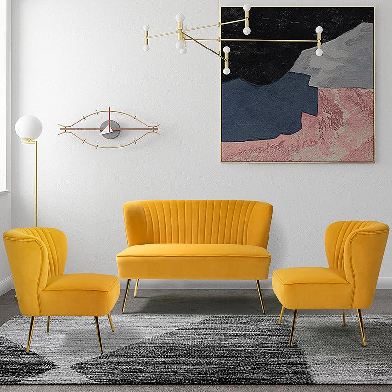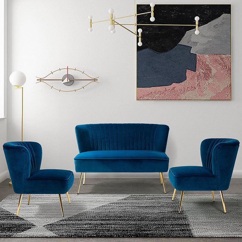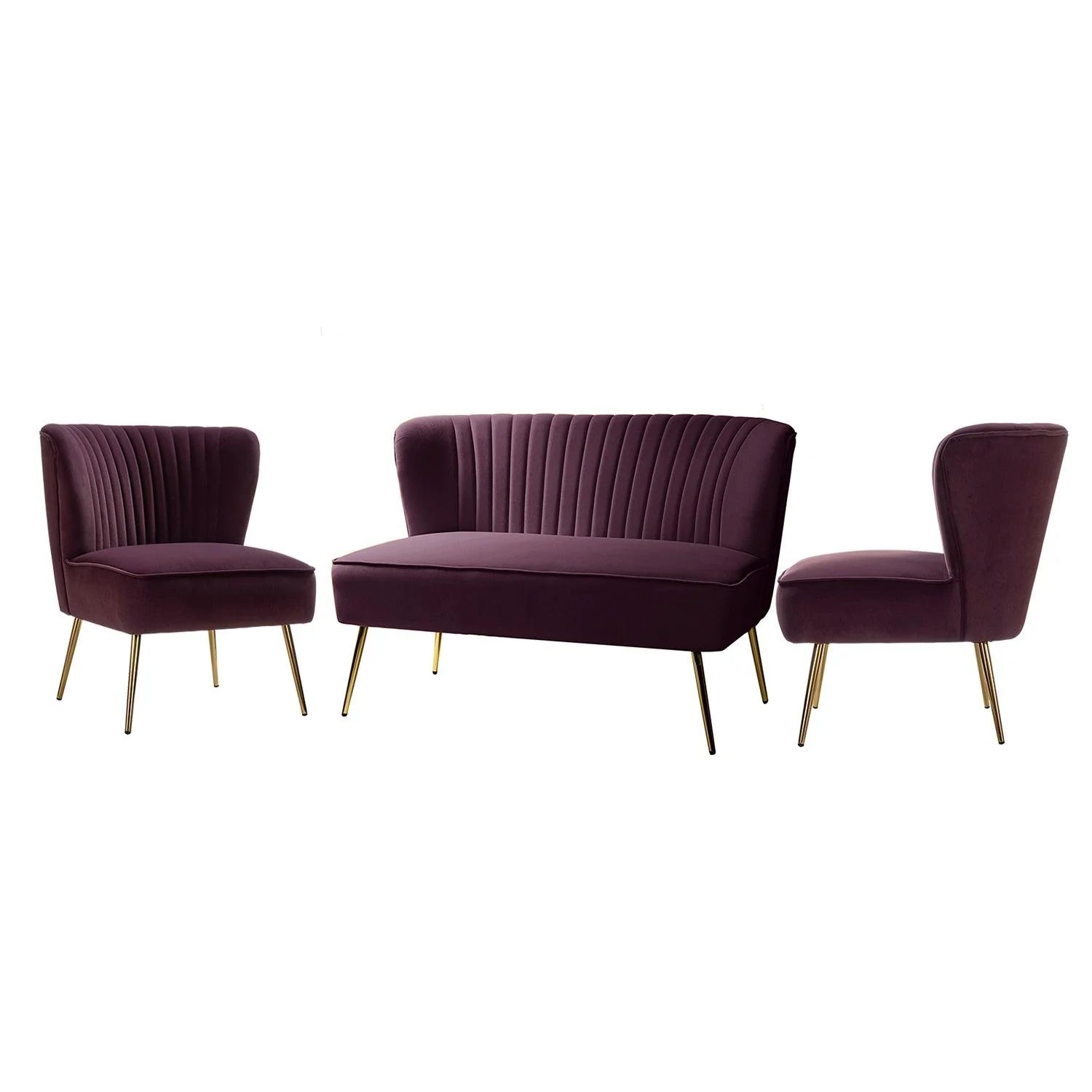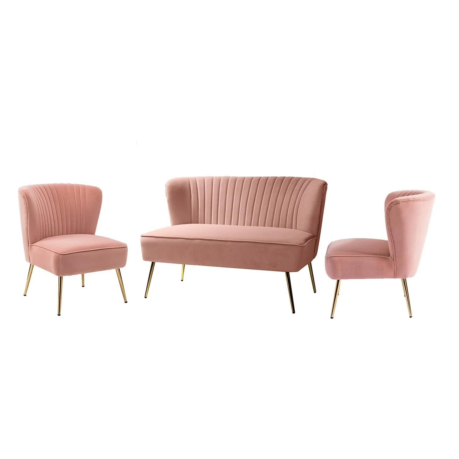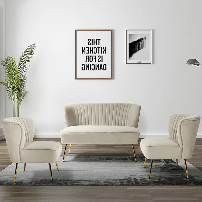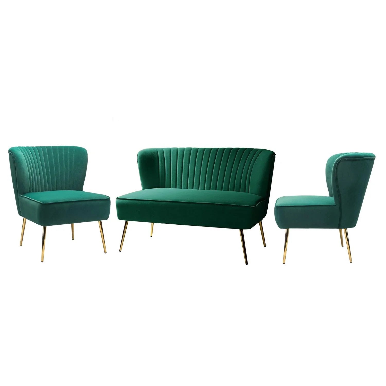 Anchor your living room in trendy, contemporary style with this three-piece living room set, including one loveseat and two matching side chairs. Crafted from solid and manufactured wood, each piece is wrapped in foam-filled velvet upholstery with gold metal legs support. This beauty is luxurious in appearance. Liven up your home with this ensemble to provide a relaxing yet eye-catching addition to your family. Plus, this three-piece living room set is defined by an iconic silhouette with a dramatic tufted back. Designed for an inviting conversation for all your guests and family, this charming collection is a good addition to a gathering, which you have been looking for. Simply transform your living room with these statement pieces to add a touch of elegance to your home. Don't hesitate to add it to your cart!