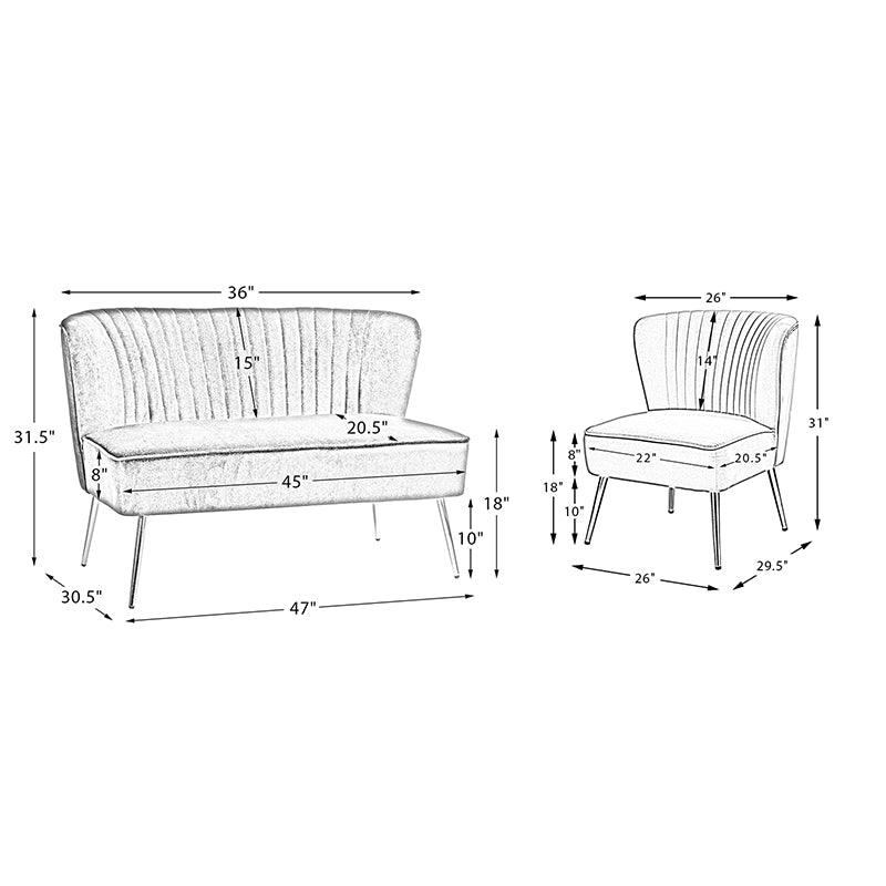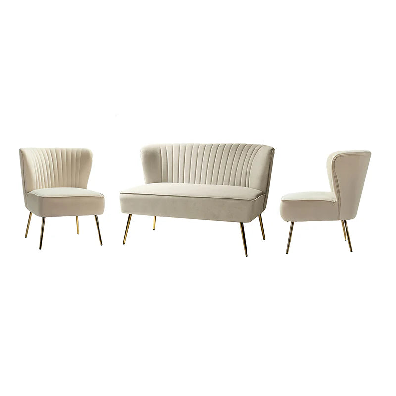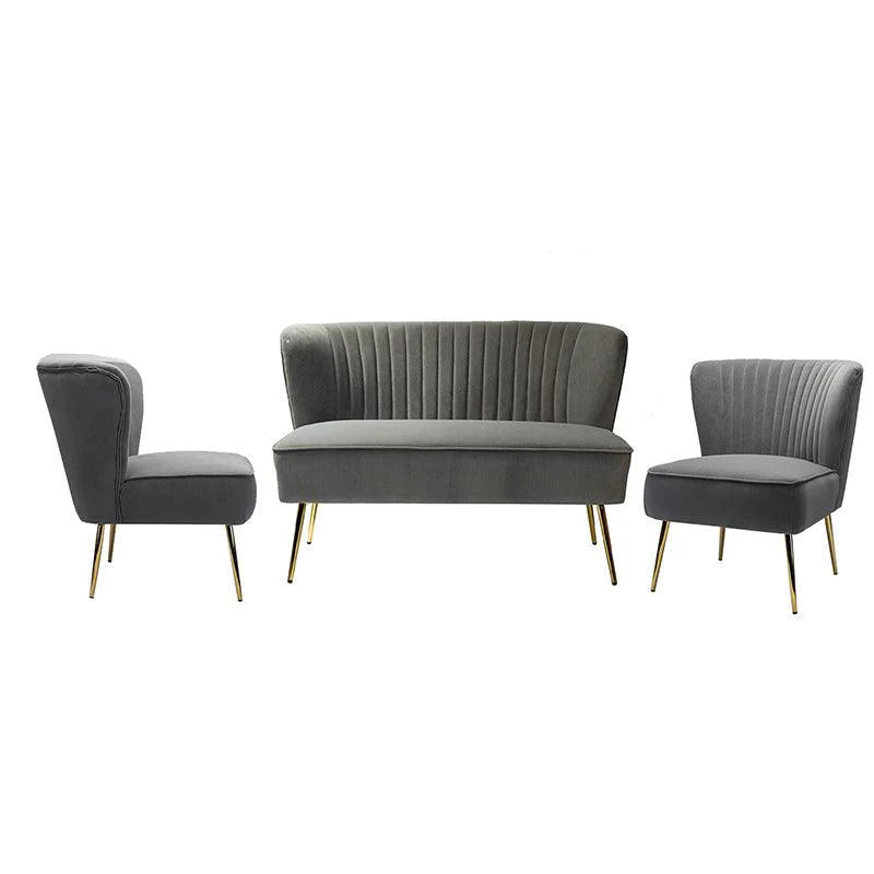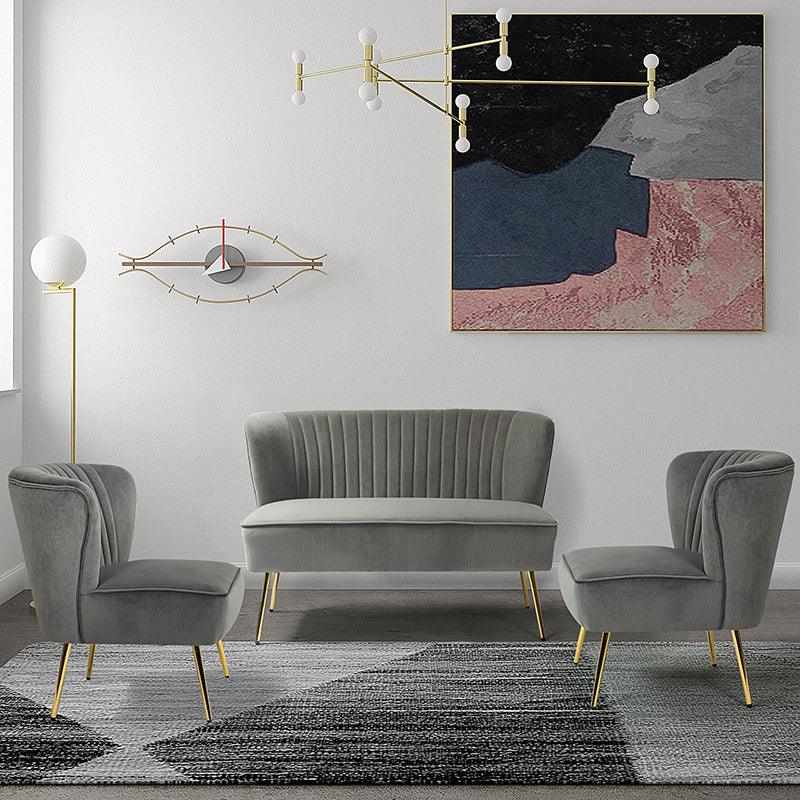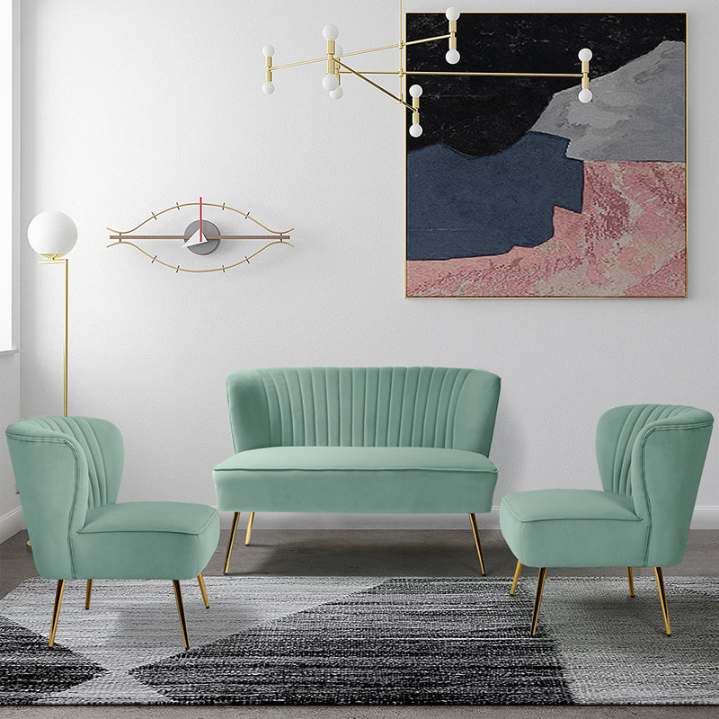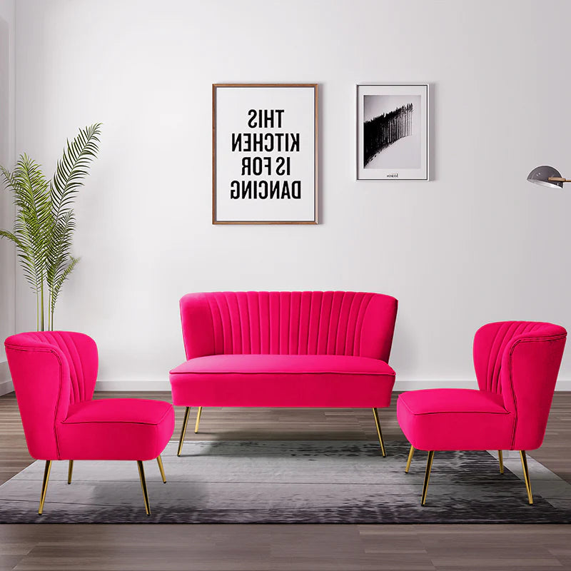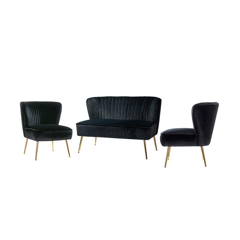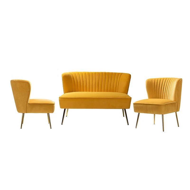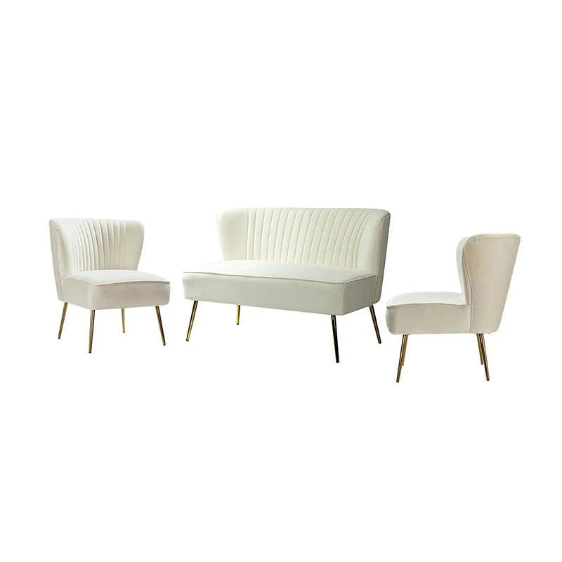 Anchor your living room in trendy, contemporary style with this three-piece living room set, including one loveseat and two matching side chairs. Crafted from solid and manufactured wood, each piece is wrapped in foam-filled velvet upholstery with gold metal legs support. This beauty is luxurious in appearance. Liven up your home with this ensemble to provide a relaxing yet eye-catching addition to your family. Plus, this three-piece living room set is defined by an iconic silhouette with a dramatic tufted back. Designed for an inviting conversation for all your guests and family, this charming collection is a good addition to a gathering, which you have been looking for. Simply transform your living room with these statement pieces to add a touch of elegance to your home. Don't hesitate to add it to your cart!