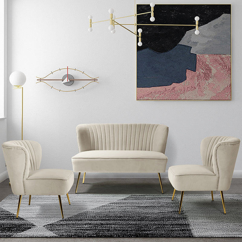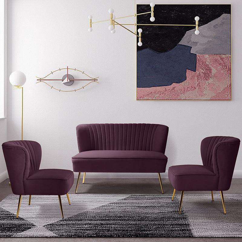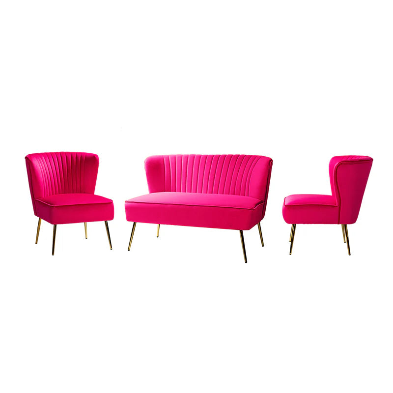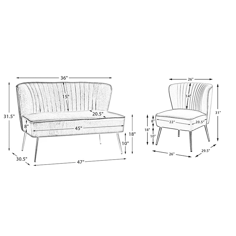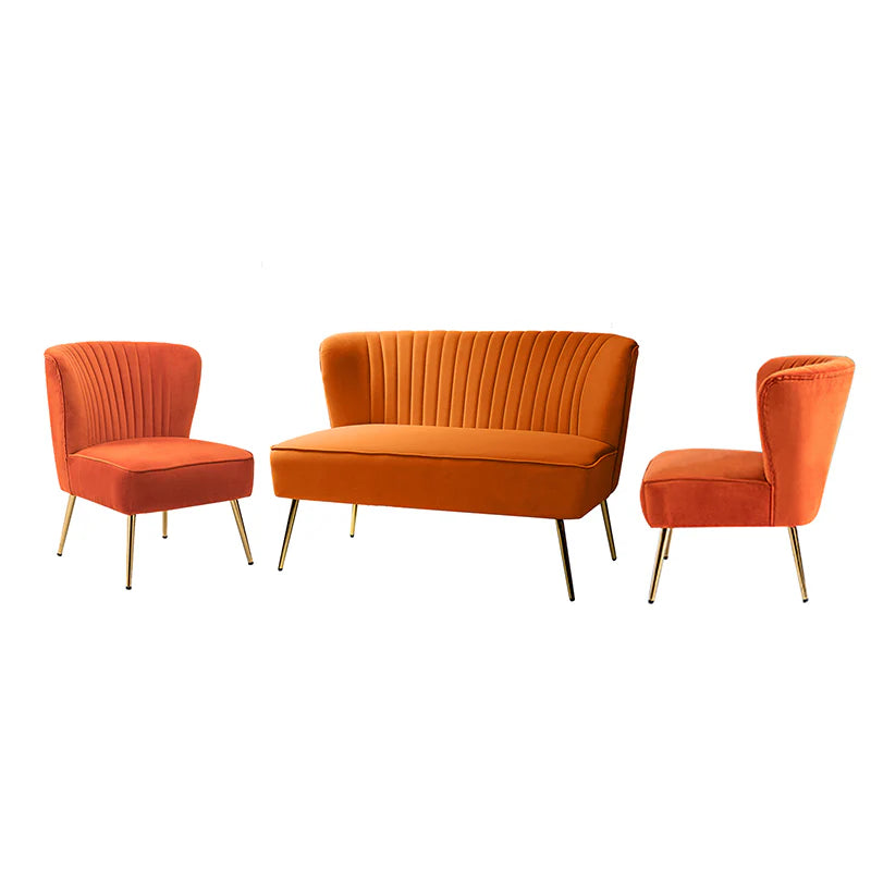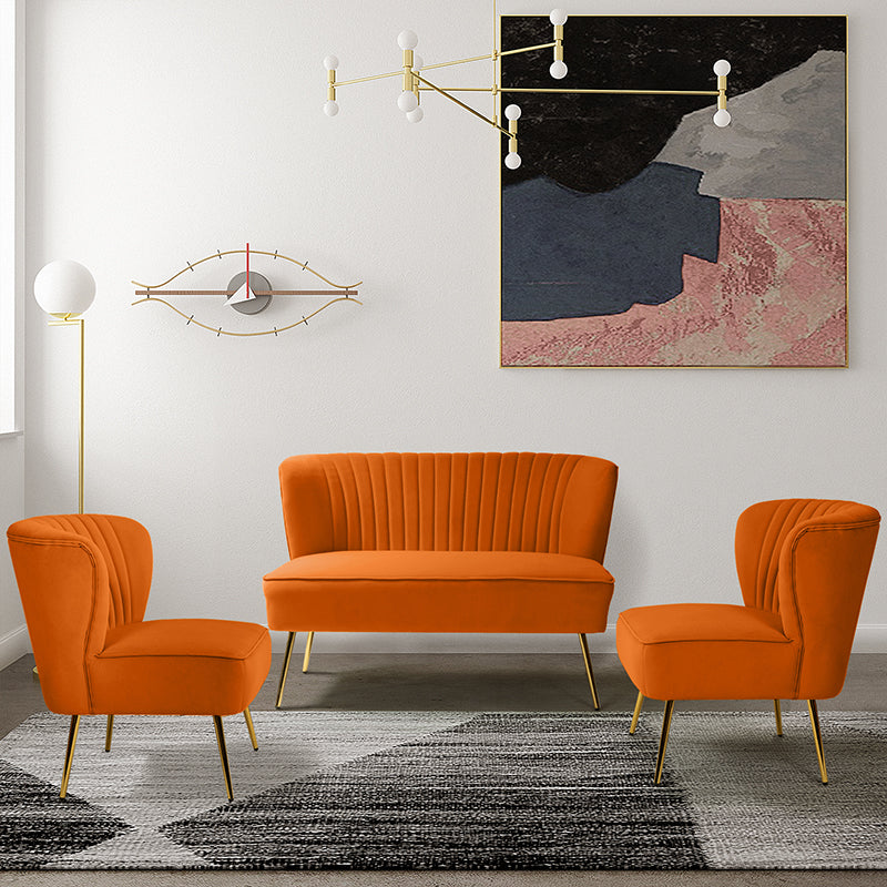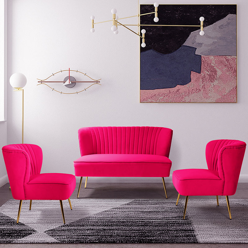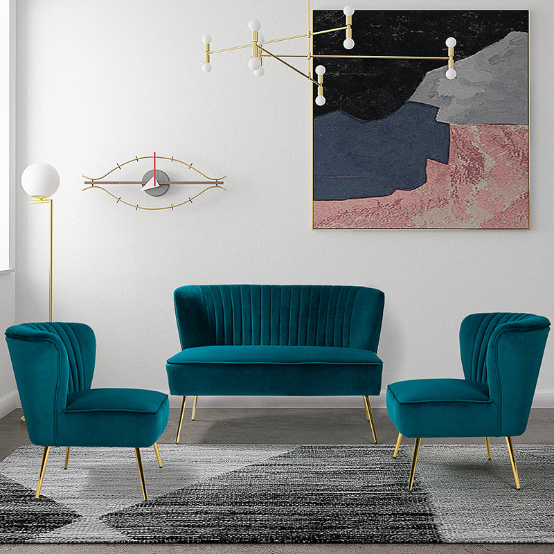 Anchor your living room in trendy, contemporary style with this three-piece living room set, including one loveseat and two matching side chairs. Crafted from solid and manufactured wood, each piece is wrapped in foam-filled velvet upholstery with gold metal legs support. This beauty is luxurious in appearance. Liven up your home with this ensemble to provide a relaxing yet eye-catching addition to your family. Plus, this three-piece living room set is defined by an iconic silhouette with a dramatic tufted back. Designed for an inviting conversation for all your guests and family, this charming collection is a good addition to a gathering, which you have been looking for. Simply transform your living room with these statement pieces to add a touch of elegance to your home. Don't hesitate to add it to your cart!