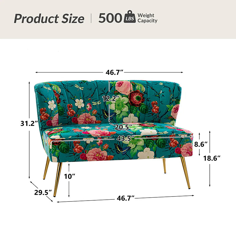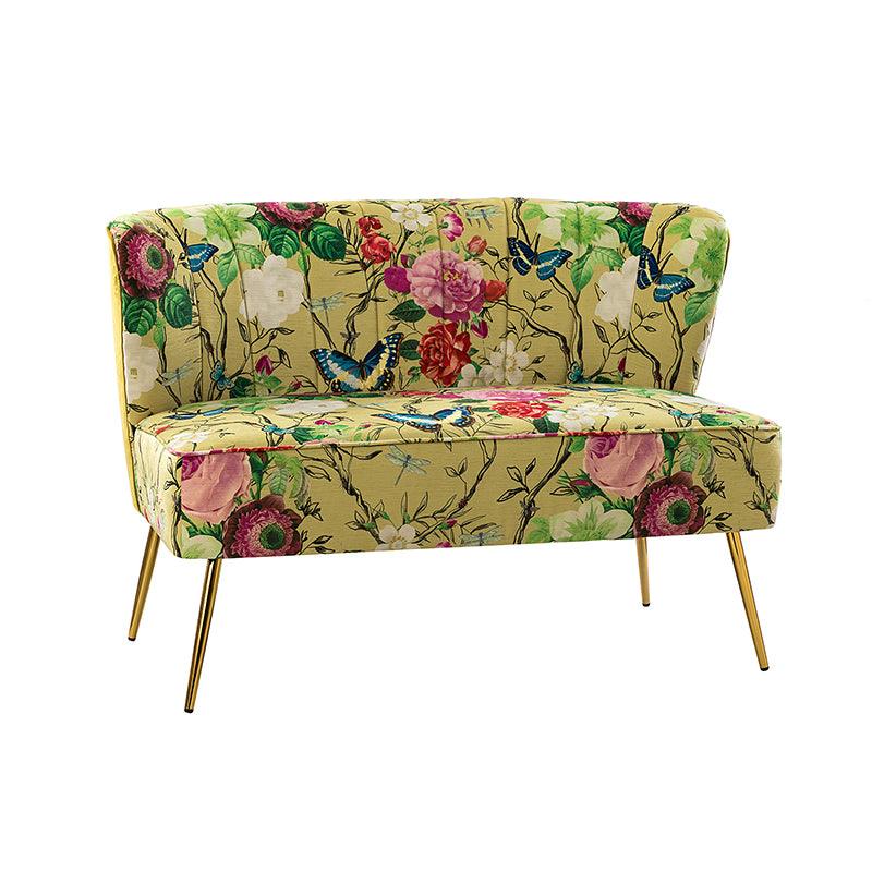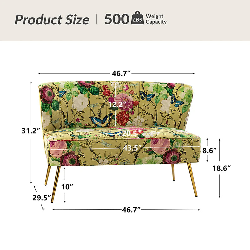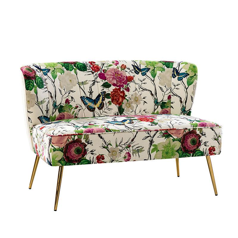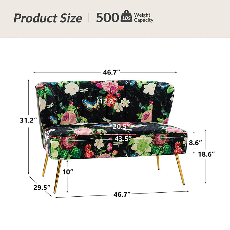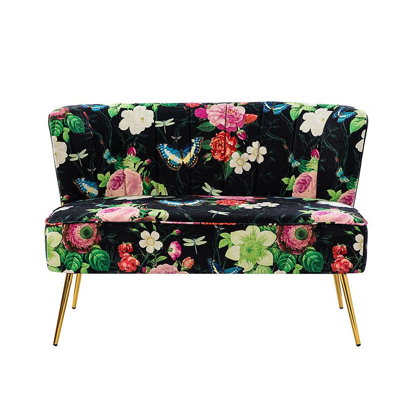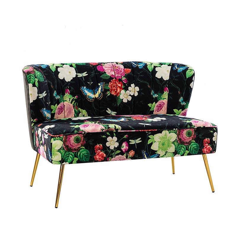 The exceptional design of this contemporary loveseat lets you create an intimate conversation area or a charming seating arrangement. The high-grade foam filling with a solid and manufactured wood frame showcases a perfect combination of comfort and support. Wrapped in a cozy fabric with dramatic floral patterns dotted, this remarkable loveseat features a channel-tufted back and plated metal legs, adding an incomparable glamor to your living spaces. Have no problems blending into your home decoration with unique characters and incredible durability. It's where quality meets great looks, suitable for bedroom, living room, and other scenes.