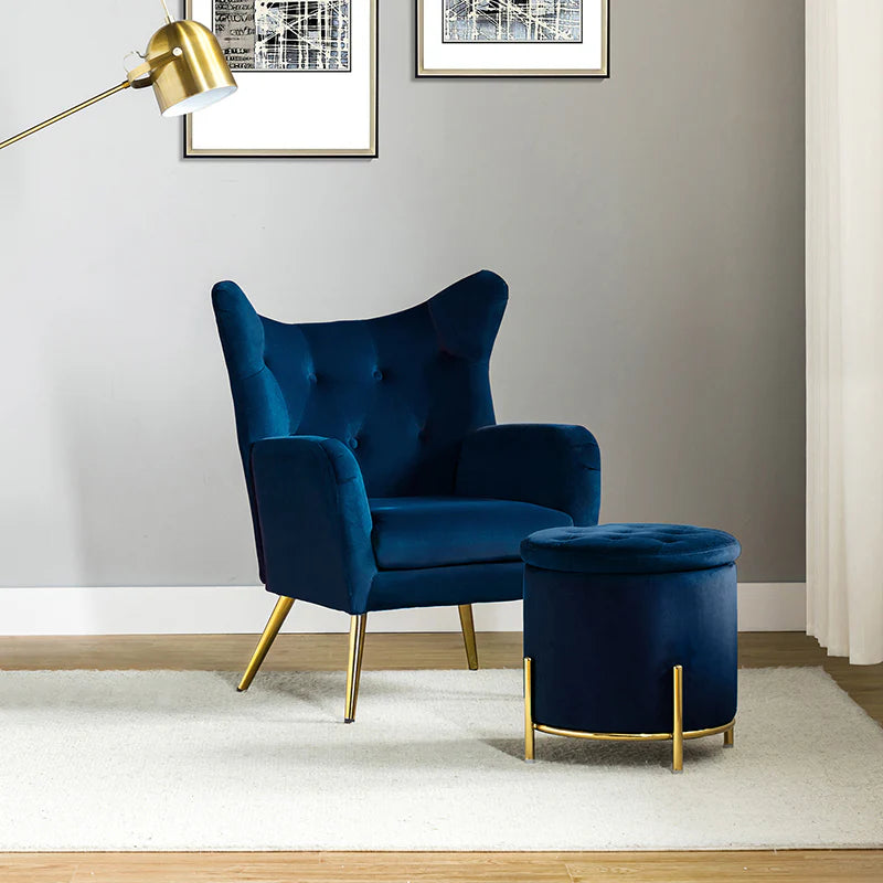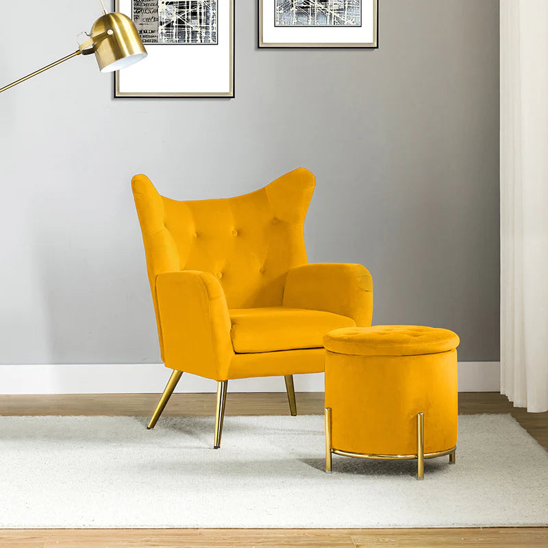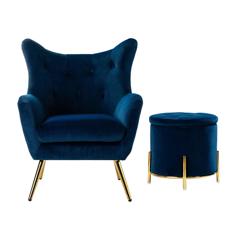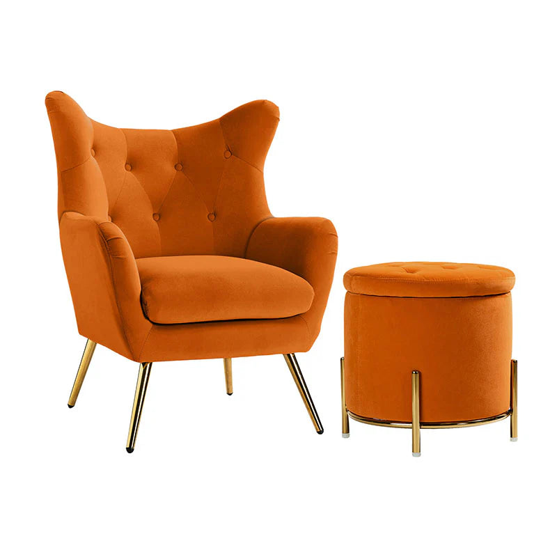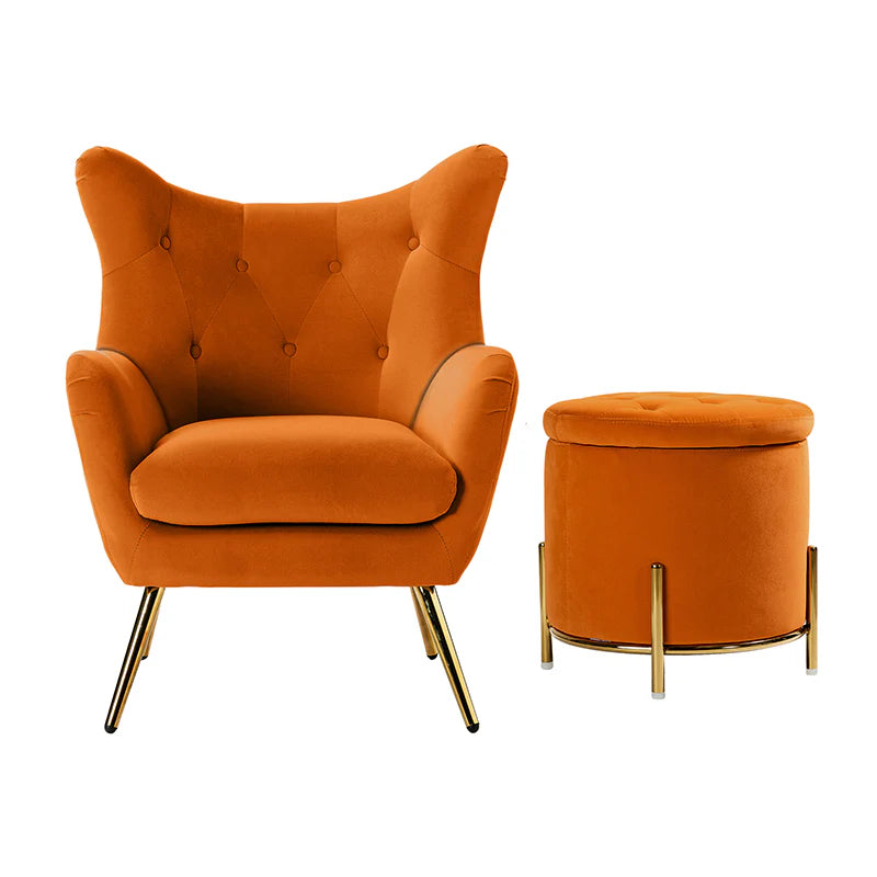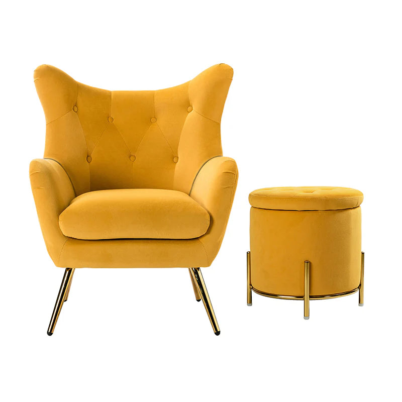 This 2-piece living room set brings elegant style to your modern and glam space. This modern living room set includes a storage ottoman and a wingback chair. This transitional ottoman adds stylish functionality to any room in your home, which is filled with dense foam cushion offering maximum comfort when being used as a footrest. This modern-style accent chair is the perfect pick for a small space. The chair which is upholstered in polyester velvet fabric for an elegant look features a subtle wingback silhouette, a button tufting, and a thick cushion to give you plenty of support as you sit. The sturdy legs are also crafted from metal, so this transitional piece is sure to last. Ideal for your bedroom or living room corner, this living room set complements contemporary and modern decor alike.