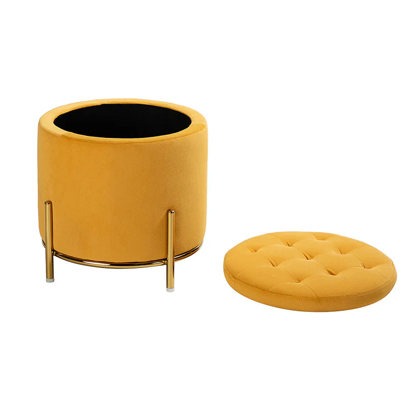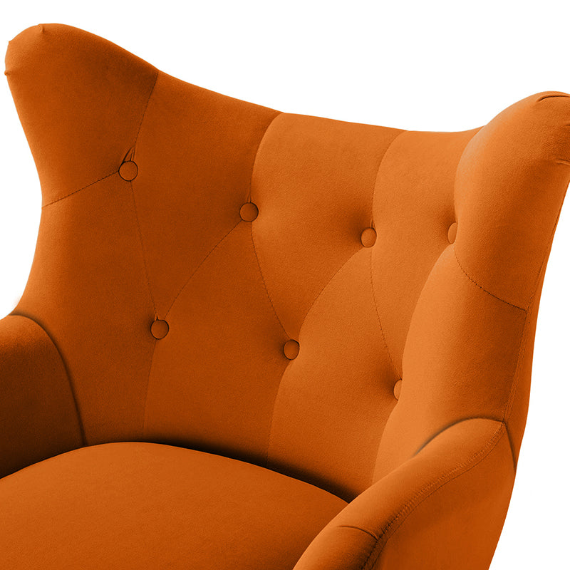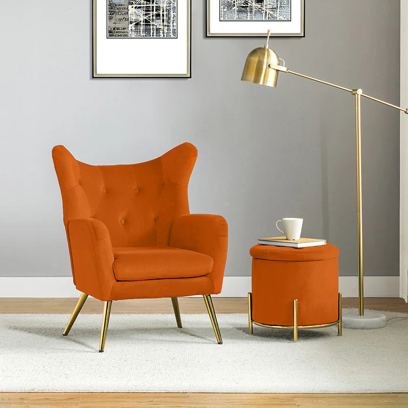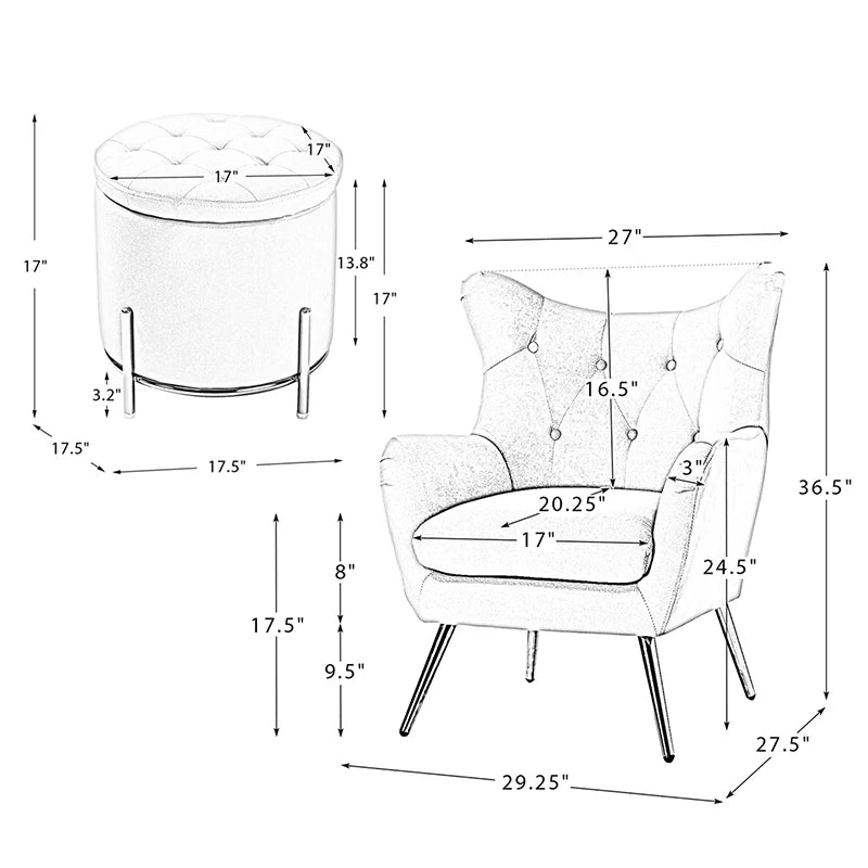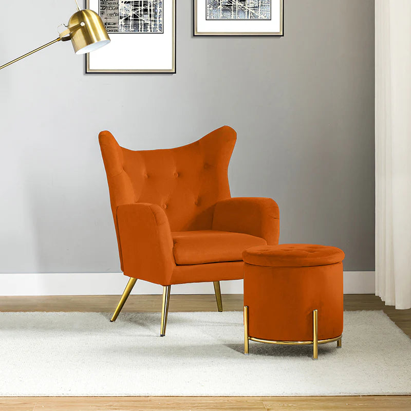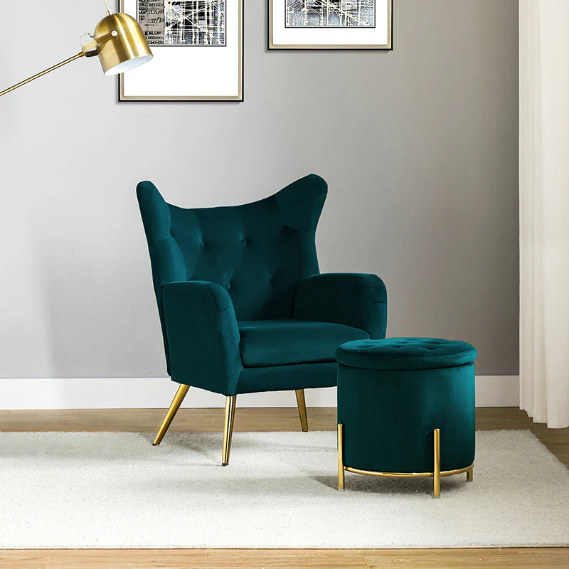 This 2-piece living room set brings elegant style to your modern and glam space. This modern living room set includes a storage ottoman and a wingback chair. This transitional ottoman adds stylish functionality to any room in your home, which is filled with dense foam cushion offering maximum comfort when being used as a footrest. This modern-style accent chair is the perfect pick for a small space. The chair which is upholstered in polyester velvet fabric for an elegant look features a subtle wingback silhouette, a button tufting, and a thick cushion to give you plenty of support as you sit. The sturdy legs are also crafted from metal, so this transitional piece is sure to last. Ideal for your bedroom or living room corner, this living room set complements contemporary and modern decor alike.