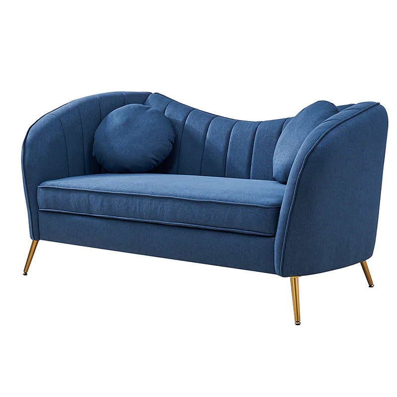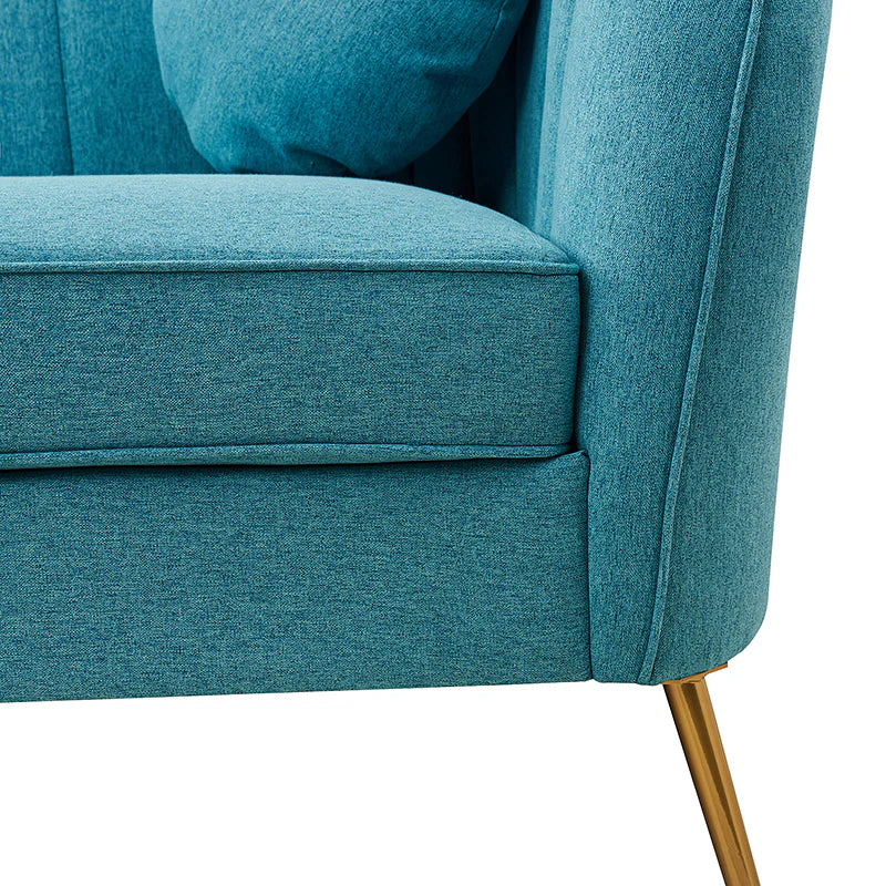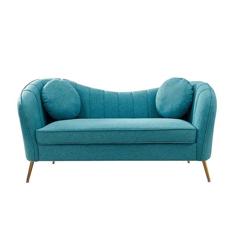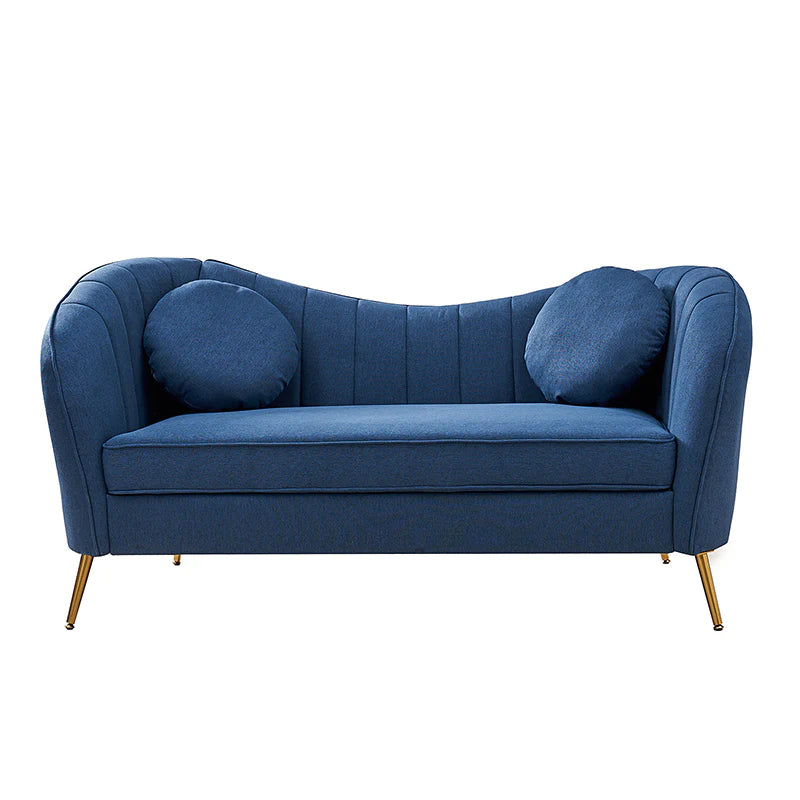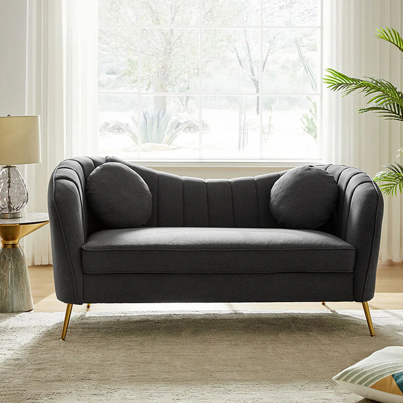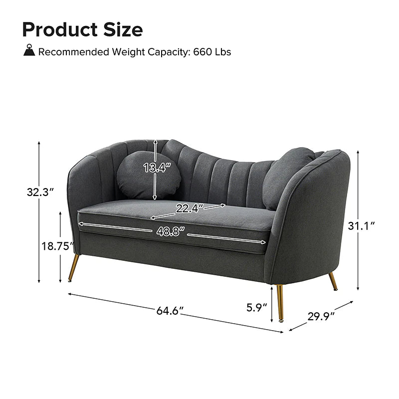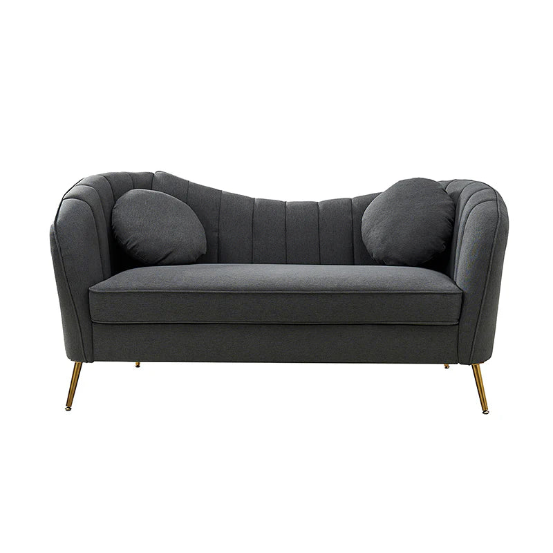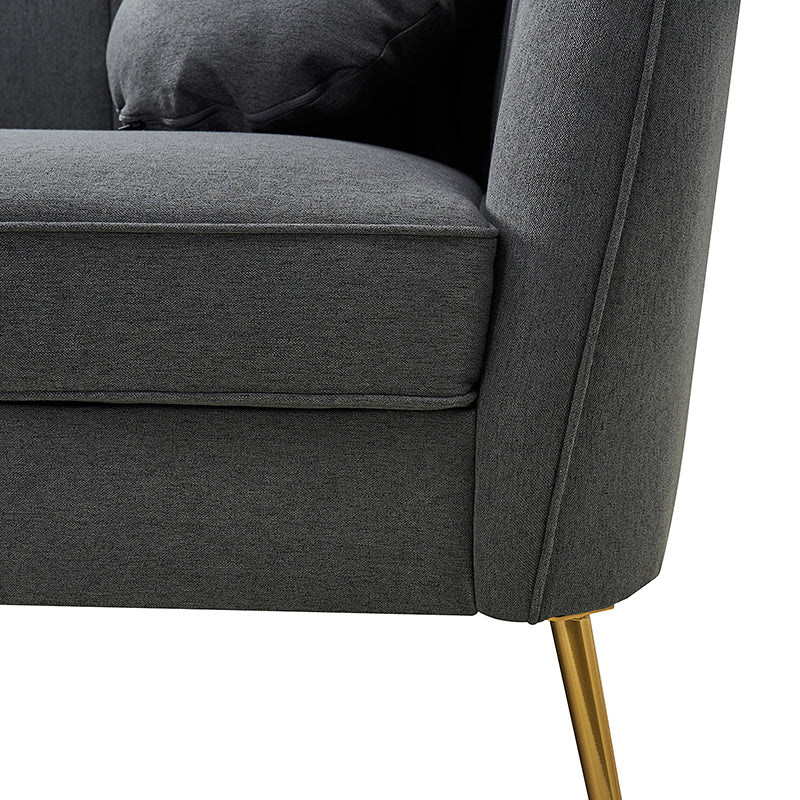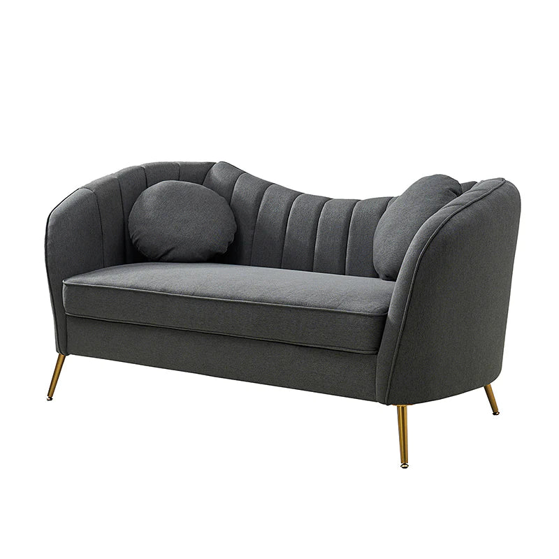 This contemporary loveseat features premium polyester upholstery that is both classy and sumptuous against your skin. A single seat cushion and round arms curve into a low, special back, creating a perfect, modern piece for your home. Gold metal legs support this loveseat and provide a stunning contrast to the soft fabric. The cushion is filled with high-density foam, which will not easily get deformed, giving you an enjoyable rest experience, like falling into the cotton or lying in the clouds. Two soft pillows add more comfort to it. You will love this loveseat, whether you're stretching out after a long day at work, enjoying a movie night, or engaging in a discussion with your friend, this loveseat supports the sweet time of being at home with the one you love.