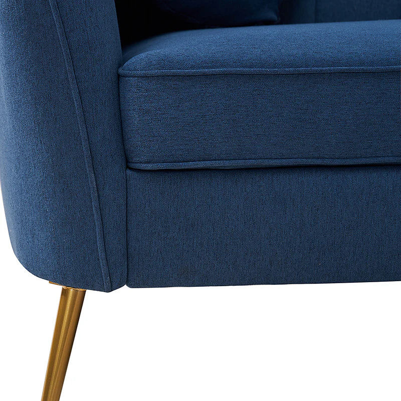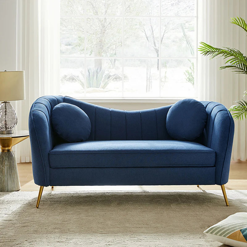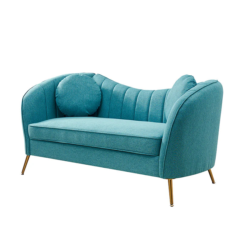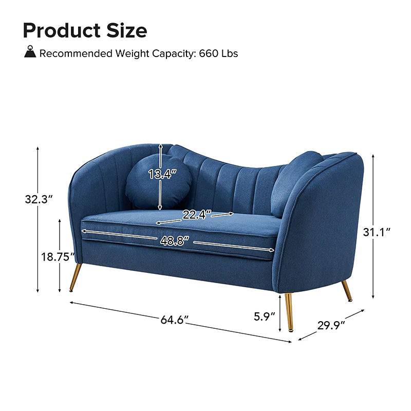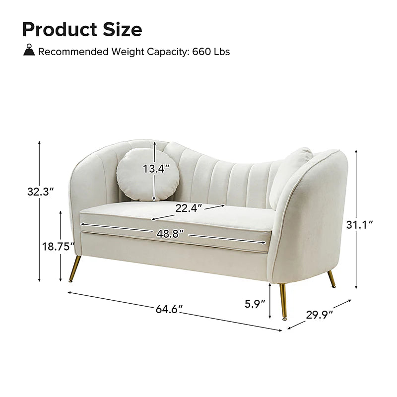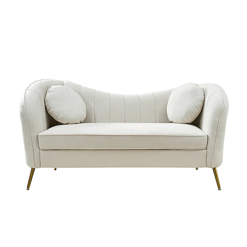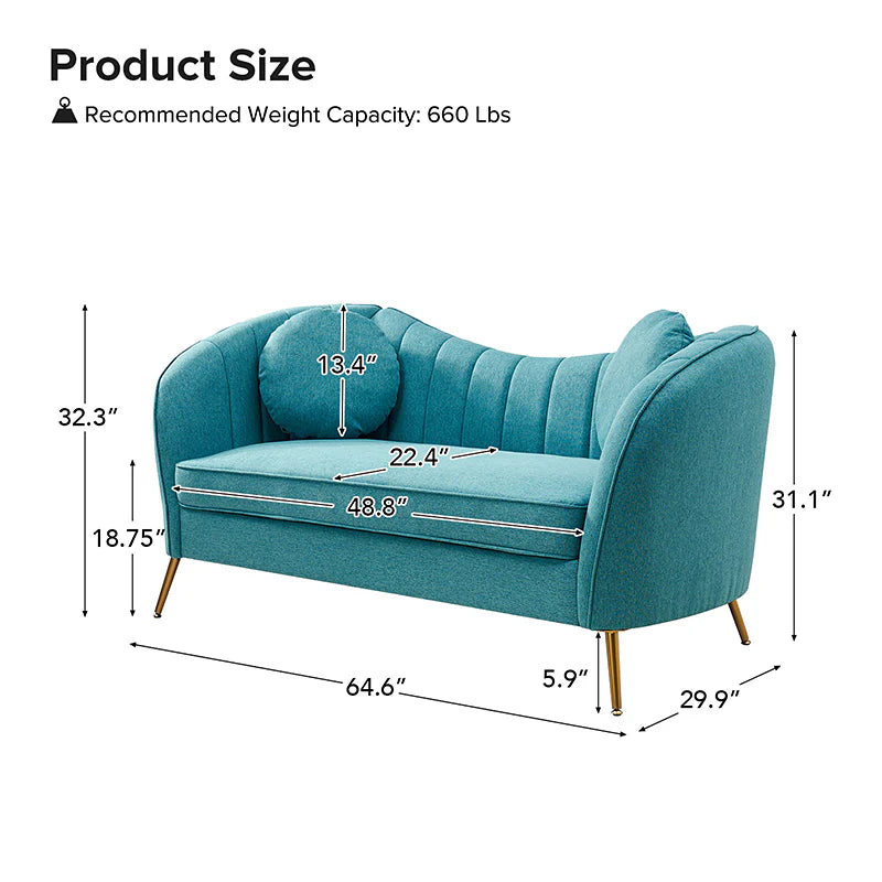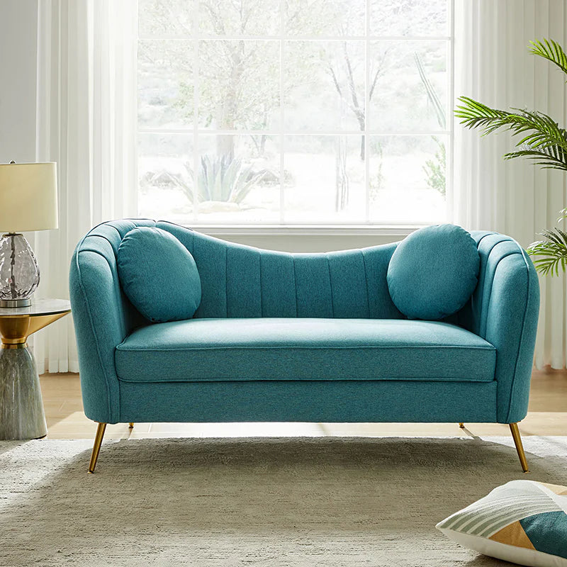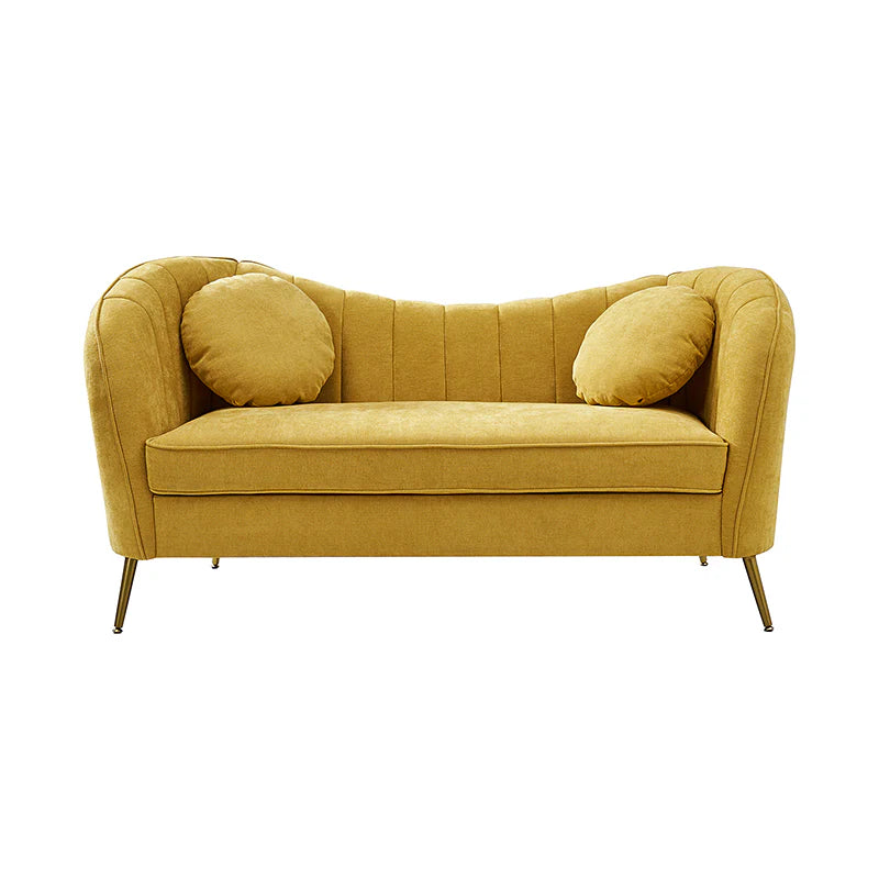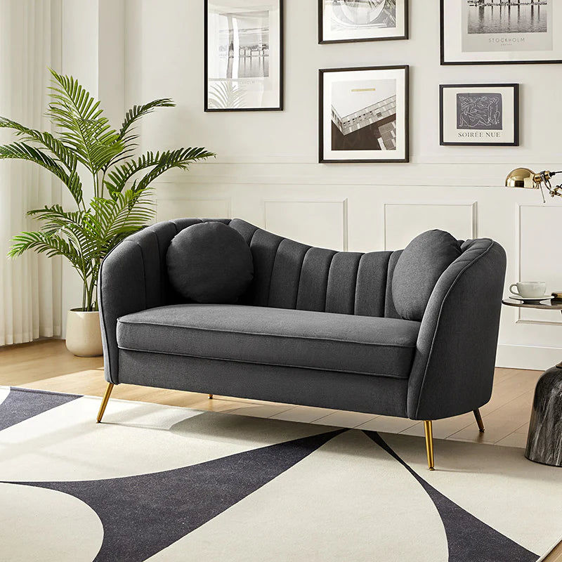This contemporary loveseat features premium polyester upholstery that is both classy and sumptuous against your skin. A single seat cushion and round arms curve into a low, special back, creating a perfect, modern piece for your home. Gold metal legs support this loveseat and provide a stunning contrast to the soft fabric. The cushion is filled with high-density foam, which will not easily get deformed, giving you an enjoyable rest experience, like falling into the cotton or lying in the clouds. Two soft pillows add more comfort to it. You will love this loveseat, whether you're stretching out after a long day at work, enjoying a movie night, or engaging in a discussion with your friend, this loveseat supports the sweet time of being at home with the one you love.