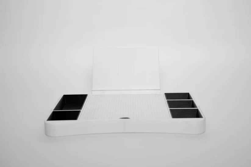 Place the cover over your desk to secure all parts when not in use, or flip it and attach it underneath the desk base for added stability.