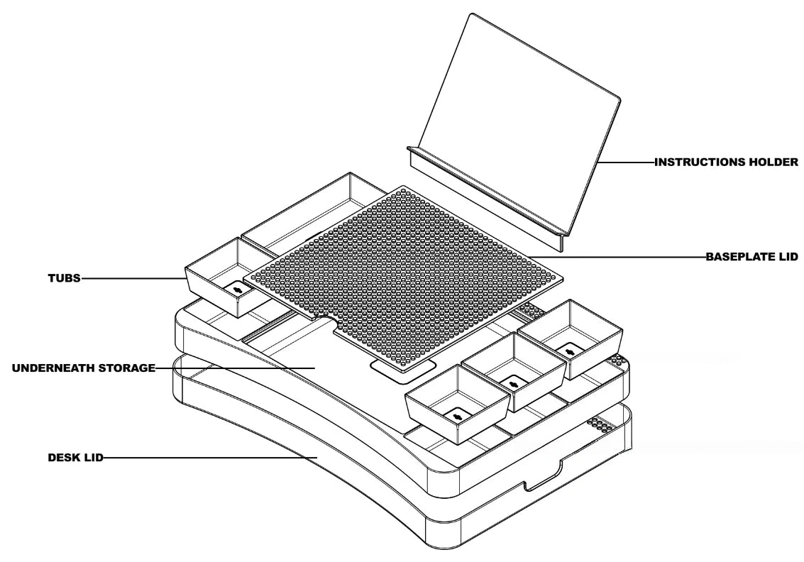 One side of the cover features a groove to hold a 32x32,48x48 or 64x64 baseplate, while the other side includes built-in studs. Prefer a flat surface? Store the baseplate under the storage bin—it’s your choice!