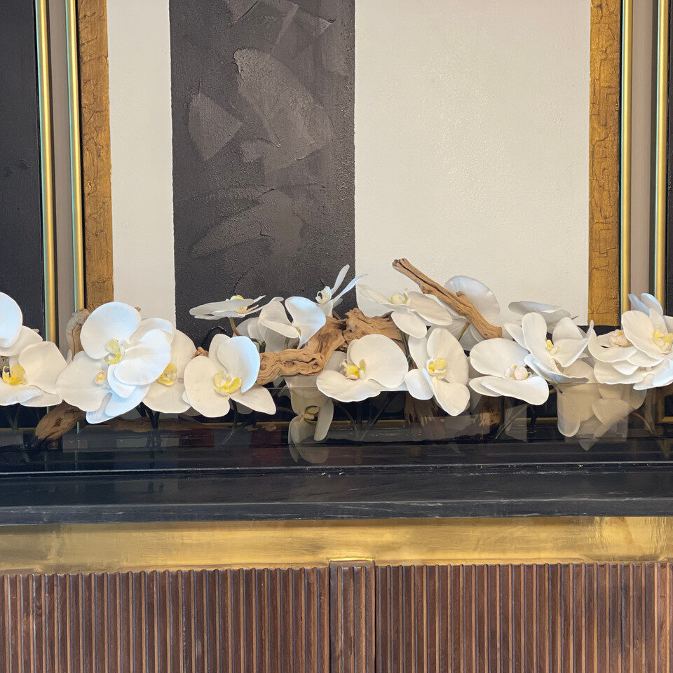 36″ Casa Moderna tinted black glass planter with white Phalaenopsis orchids, sandblasted grape wood, white stones and our illusion water. The stunning sight of a Phalaenopsis orchids in full bloom is nothing less than breathtaking. Their huge, curving petals; double rows of gorgeous blooms march along our casa moderna glass plate planter. This translucent modern glass planter features 90 degree angles and a modern linear design. The sight of a massed display of Phalaenopsis orchids is so arresting that we have paired it with natural sandblasted grape wood to achieve a beautiful and organic contrast.