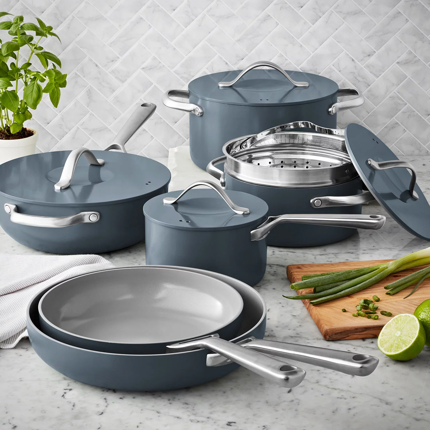 Our 11-Piece Modern Ceramic Cookware is a stylish addition to the kitchen that makes healthier cooking easy. Enjoy perfectly cooked steaks, stews, scrambled eggs and sauteed veggies with this versatile set of pots and pans, including two Dutch ovens. Featuring nonstick interiors and durable heavy-gauge aluminum construction, this long-lasting set of cookware makes it so you can cook with less oil and fast cleanup.