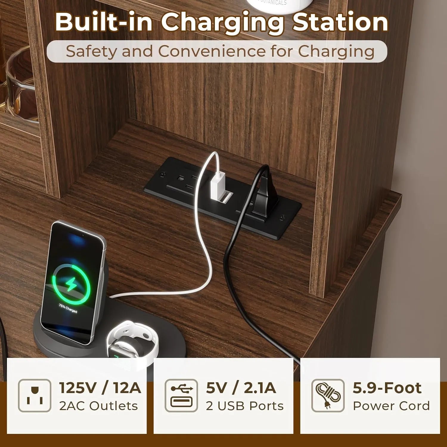 • Vanity Desk with Charging Station: This modern vanity desk comes with a power strip that includes 2 standard plug sockets and 2 USB ports, allowing you to sit at your vanity and use your hair dryer or curling iron within easy reach and charge your phone, tablet, or other electronics.