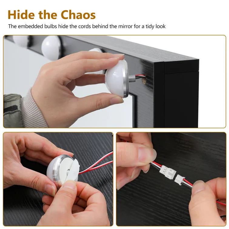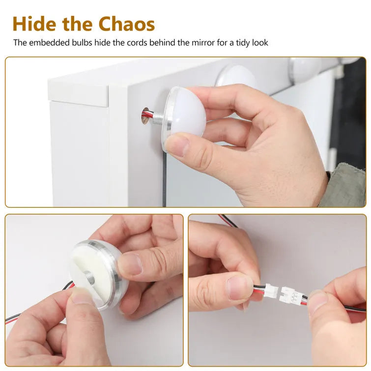 Vanity set with super large mirror: with a full-size large lighted mirror makeup vanity, you will no longer need to move your body from side to side to search for the best makeup angle like in the past! Meanwhile the 12 Hollywood light bulbs with color & brightness adjustable, easier to view your makeup details, whether prepping for a new day in the early morning or gearing up for a dinner date, you'll be perfectly perched on this vanity with a large mirror.