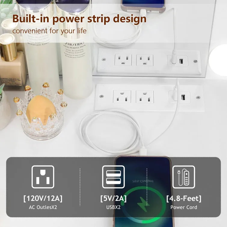 • Vanity Set With Charging Station: Owning a makeup vanity table with a charging station (2 standard plug sockets & 2 USB ports included) makes it no need to find an extra power outlet for your hair dryer/curling iron and instantly completes a perfect hairstyle in front of this vanity.