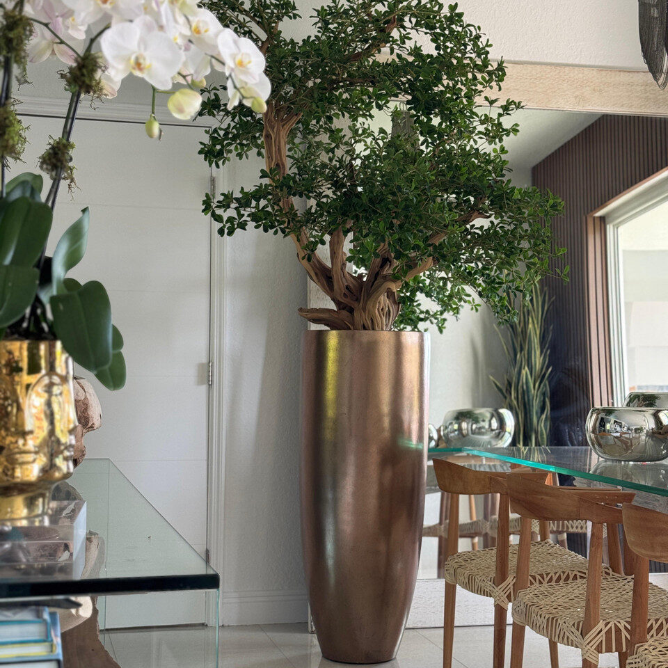 In bonsai culture, trees often carry symbolic meanings. The Black Olive Bonsai, admired for its intricate structure and ability to thrive in tough conditions, represents resilience and strength. Our artificial Black Olive Bonsai embodies these qualities, showcasing its unique elegance and lifelike design. Paired with our gold Revolver planter, it features dense, dark, glossy green leaves and a naturally preserved, gnarled, twisted trunk, creating a striking and visually enchanting display.
