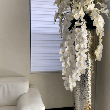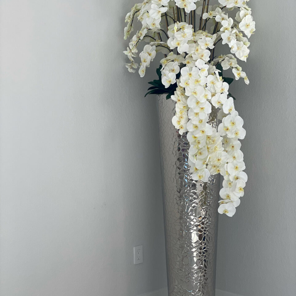 The ultimate luxury statement, this design features a extra tall hammered stainless steel tapered cone planter paired with beautiful cascading white phalaenopsis orchids. Each piece is carefully crafted to achieve a luxurious look. No need to water these beauties! Durable, they will last you years, and will remain beautiful year round! Designed with the upmost attention to detail and manufactured from top quality material, this piece is both luxurious and realistic.