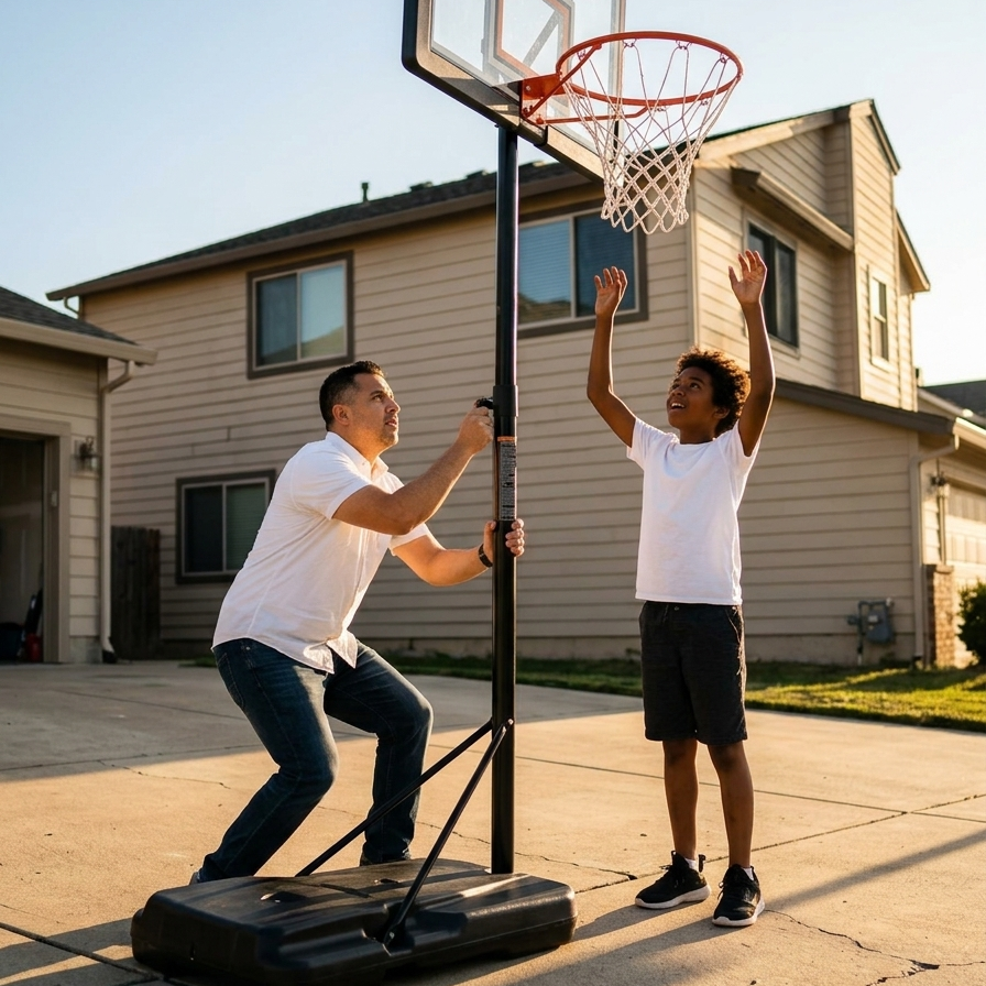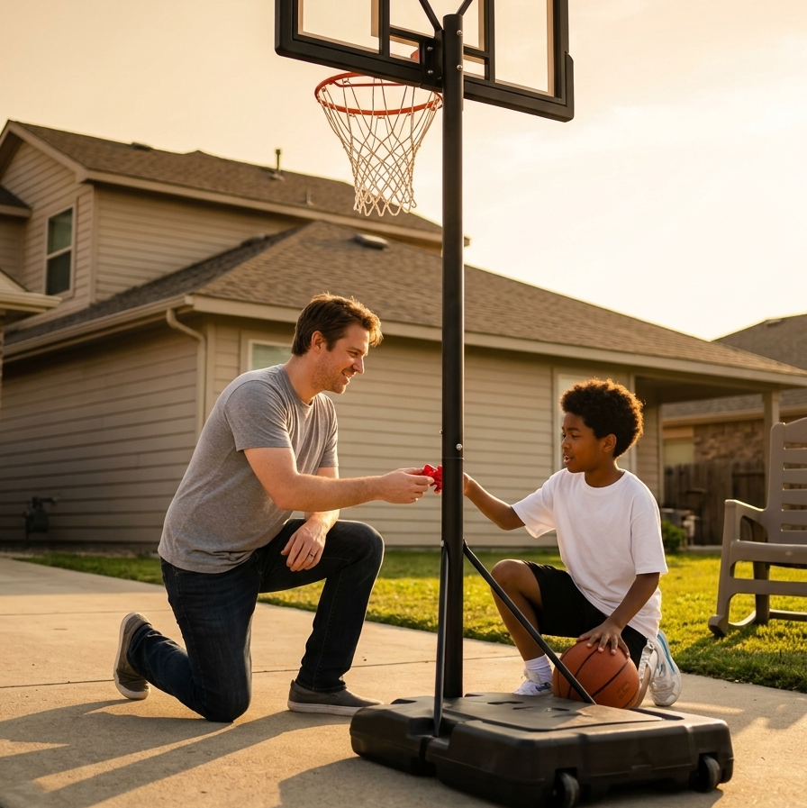 Steel rim, shatterproof backboard, all-weather net. Rain, wind, slam dunks. Nothing breaks.