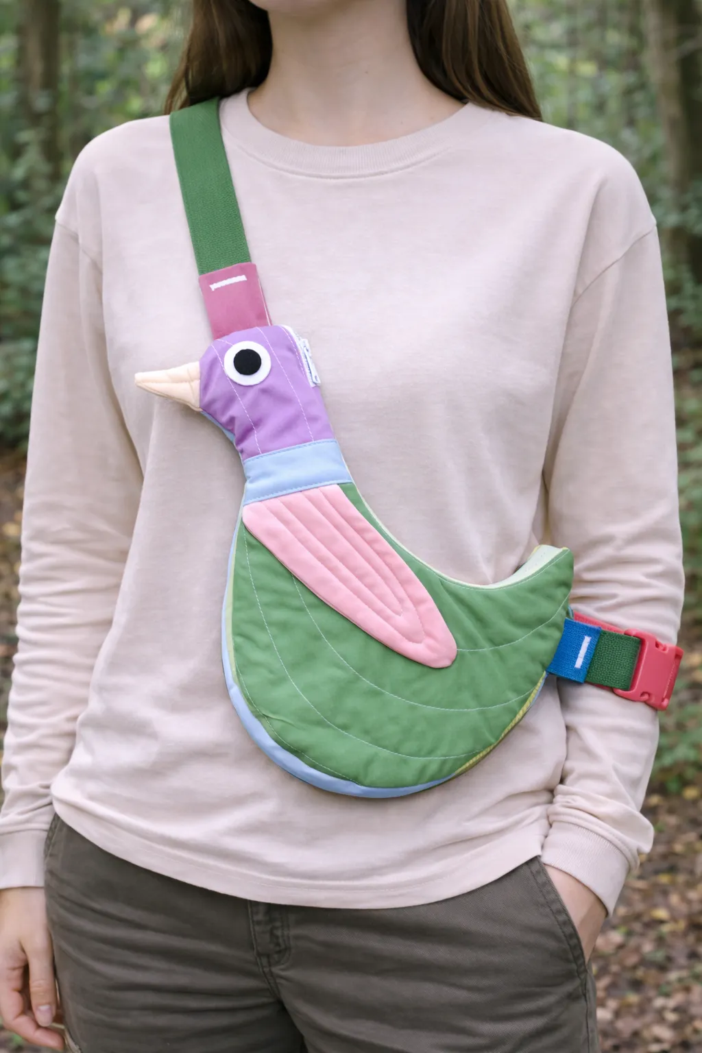 The Fly Away Crossbody is a sling bag shaped like a bird! This is a completely handmade bird bag that will quickly become your go-to crossbody. Besides the adorable bird front, it has a mosaic of colorful fabric and notions for the interior, strap, zipper, and back side. The bag can be worn like a sling or a shoulder bag, and the strap is fully adjustable. Gorgeously soft quilted bag made from 100% cotton fabric and batting 100% cotton strap with high-quality plastic buckles and zipper Fully-lined interior Bag faces the right side of the body while you’re wearing it. It features a front designed to resemble a duck, with green, pink, and purple coloring. The bag interior pictured here is just an example; the interior colors of each bag vary. Hand-wash with water and gentle soap only.