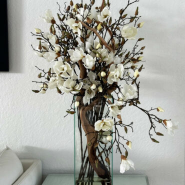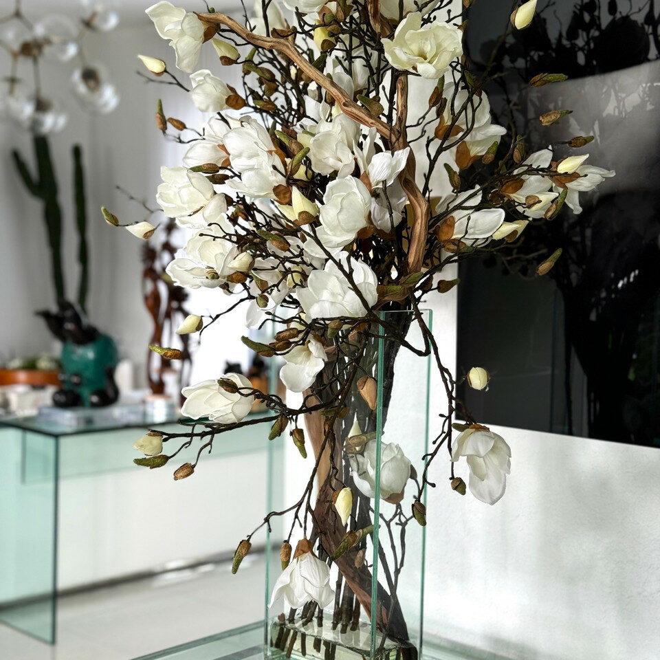 20″ tall Casa Moderna glass planter with multiple stems of white magnolia blossoms, foliage and sand blasted grape wood anchored in our illusion water. Enjoy beautiful, lifelike magnolia tree branches that won’t fade after spring awakens. Displayed here in a stylish clear glass planter, magnolia flowers are cheerful and elegant in any season. Each hand-placed blossom and leaf is crafted with vivid color and exceptional detail, a tribute to Mother Nature’s artistry. Showcase this lovely faux tree on your dining table or living room tabletop.