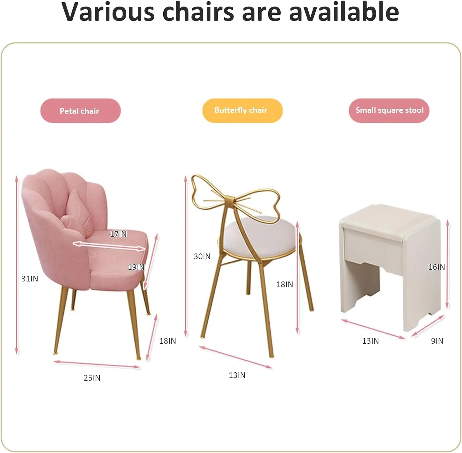 • VARIETY OF COMFORTABLE CHAIRS TO CHOOSE FROM: Blossom Stool, Square Stool, and Butterfly Stool, providing comfortable elasticity for your leisurely makeup sessions.