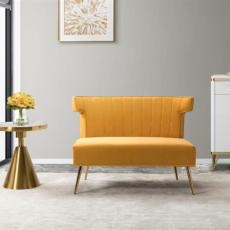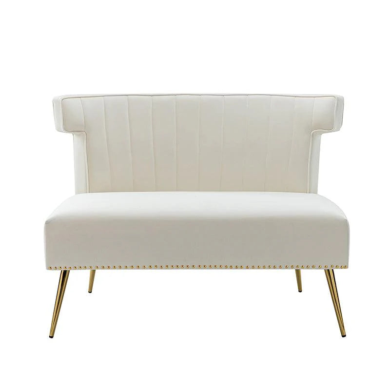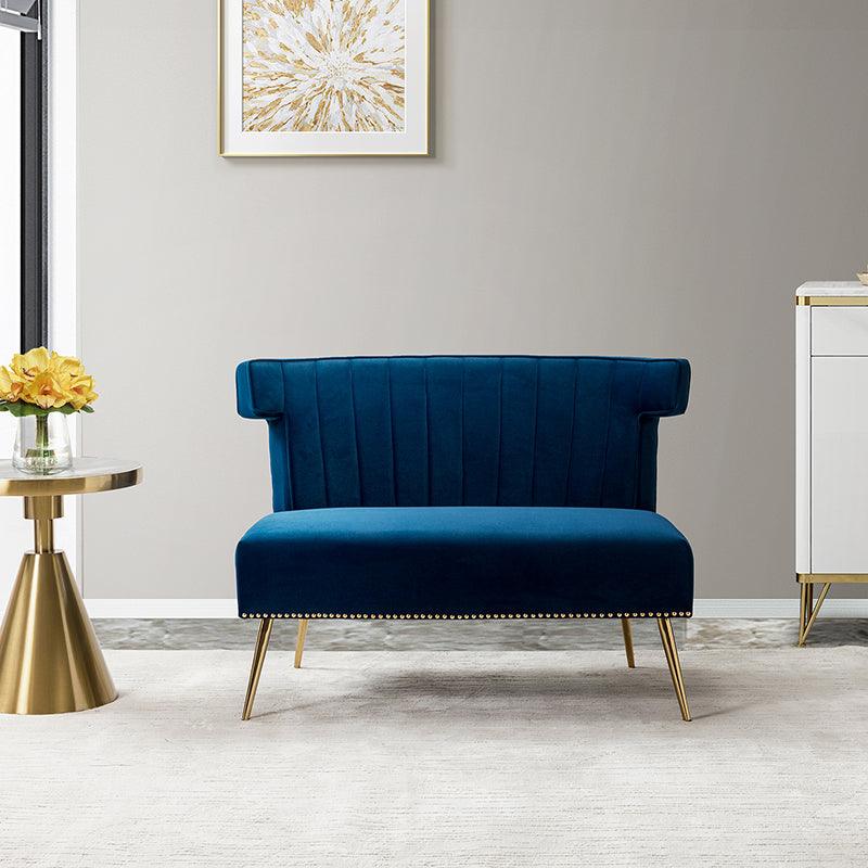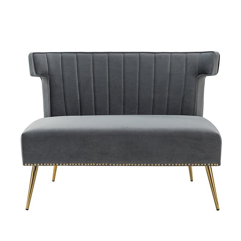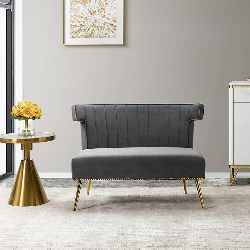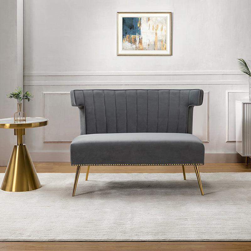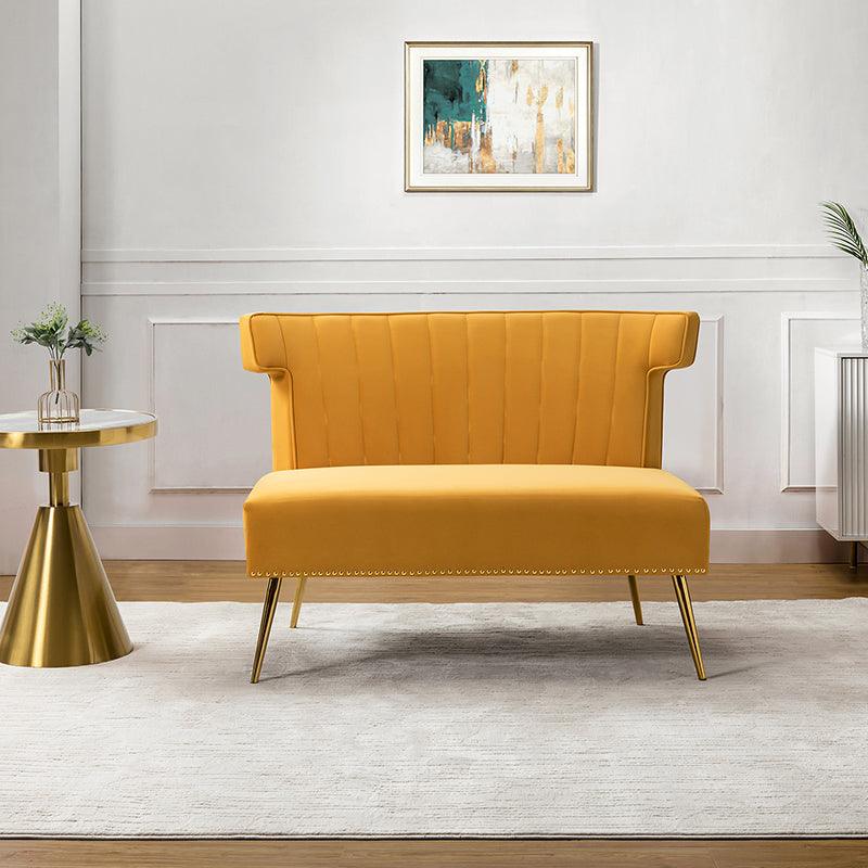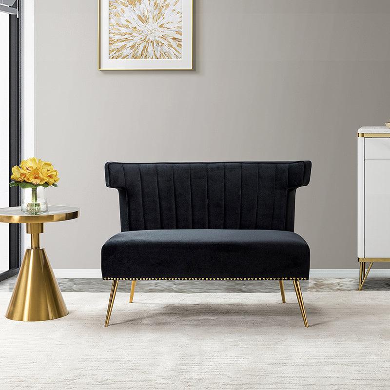 This loveseat brings a delicate silhouette and tailored touch to your living space. This is the classic and contemporary style accent loveseat with glam nail head trim and shiny golden legs. Made with premium velvet fabric, comfortable for skin touch, and features an on-trend solid hue that is bound to blend in with your color scheme. Foam filling and springs in the seat give you just the right amount of support as you sit. This loveseat features an armless design and a channel-tufted back. We love how its wingback style and nail head trim add a refined finish. Use this space-conscious piece as an accent in your living room or spare seating for your bedroom.