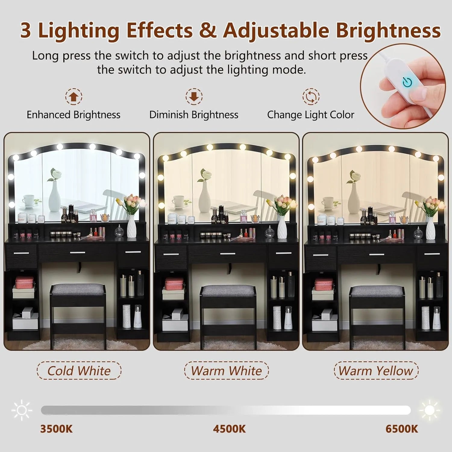 usikey Large Vanity Set with Large Lighted Mirror, Modern Makeup Vanity Table with 3 Drawers, 2 Storage Cabinets & 10 LED Bulbs, Dressing Table with Cushioned Stool for Women, Bedroom, Black