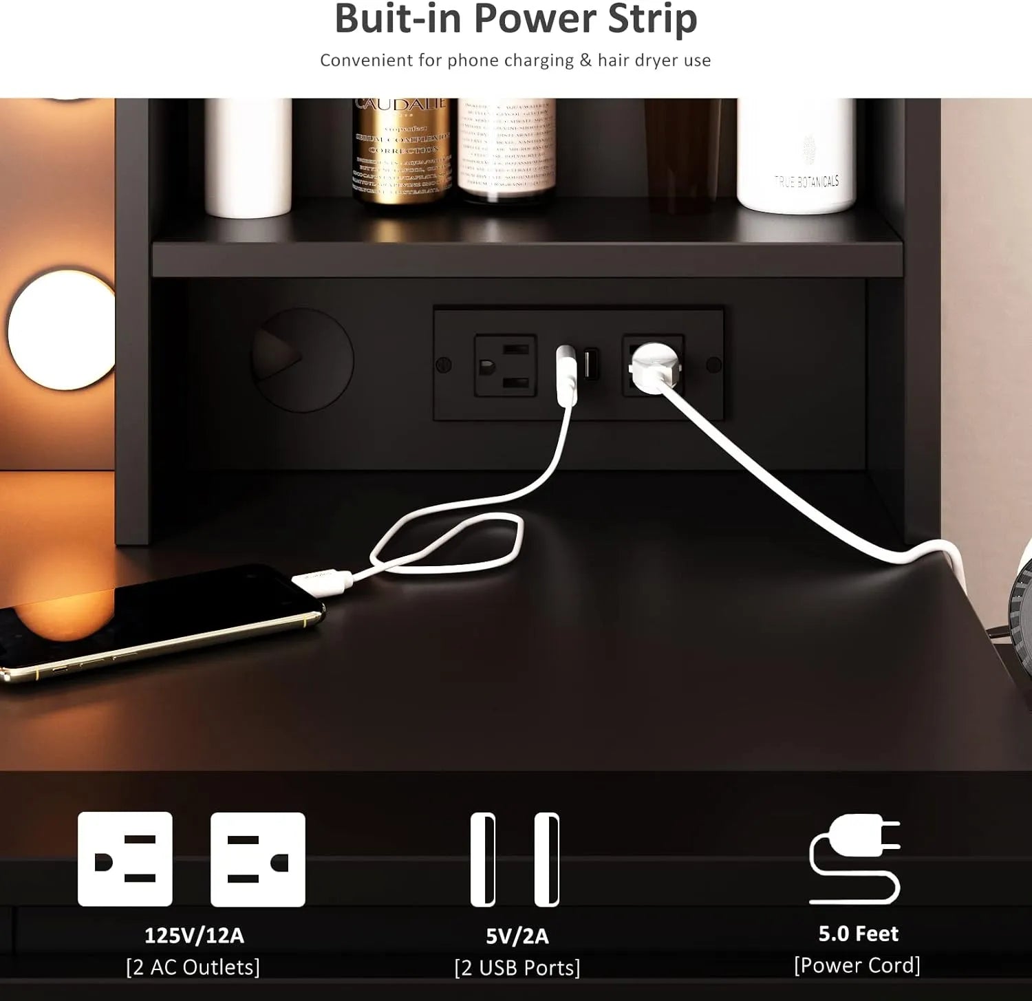 Package Content: 1 x Dressing Table, 12 x LED Bulbs, 1 x Accessories, 1 x Hair Dryer Rack, 1 x Power Strip, 1 x Instruction.
