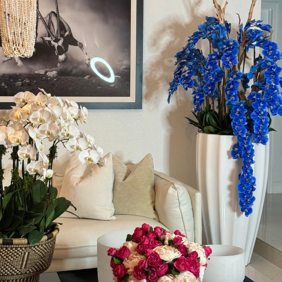 In this breathtaking arrangement, graceful blue phalaenopsis orchids and driftwood intertwine, creating a truly captivating display that radiates refinement and grace. By juxtaposing the ethereal blue orchids against the sleek, glossy white San Jose planter, a striking contrast of black and white is achieved. The delicate placement of the orchids, accompanied by their lush foliage and the inclusion of magnificent California driftwood, seamlessly brings this sculptural masterpiece to life, evoking a sense of realism that is truly awe-inspiring. Designed to leave a lasting impression, the San Jose planter adorned with cascading blue orchids is not only a showstopper but can also be customized to suit different heights, planter sizes, and even colors, catering to the unique preferences of each individual.